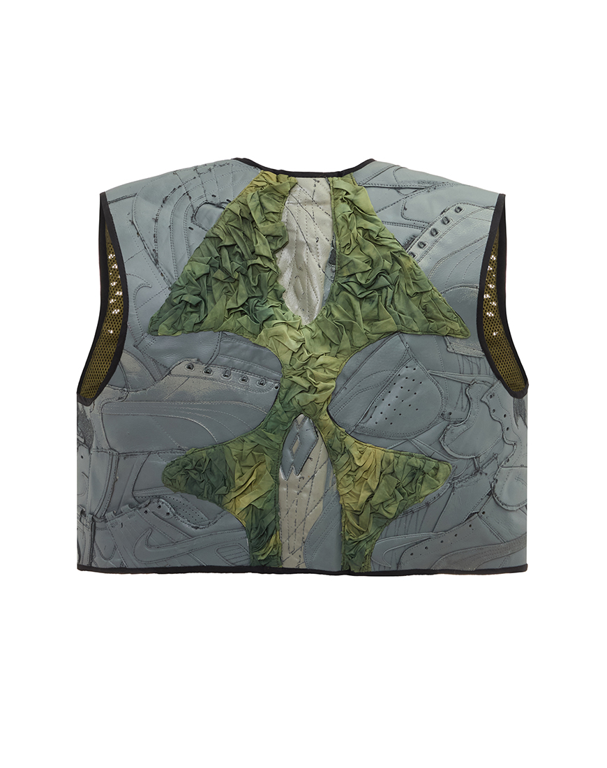 Цей укорочений карго-жилет виготовлений із перероблених кросівок і покритий спеціальною фарбою, що поступово стирається під час носіння, відкриваючи справжню фактуру матеріалів. Вставки зі стокового нейлону, прошитого вручну для створення рельєфної структури та пофарбованого вручну, додають виробу тактильності та глибини. Регулювальні фастекси, дві функціональні кишені та продуманий силует роблять жилет ідеальним як самостійний елемент гардероба або як акцентний шар у багатошарових образах.