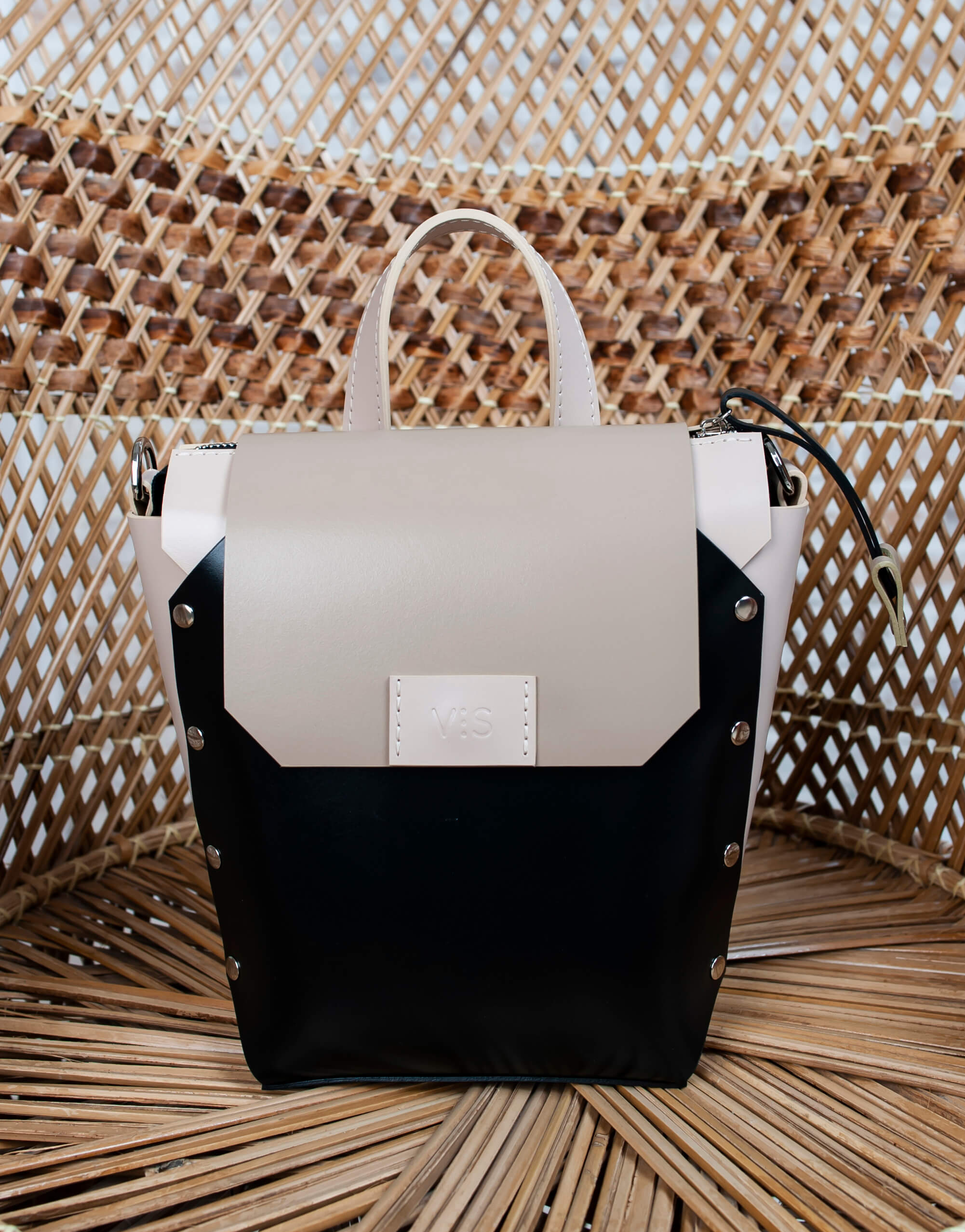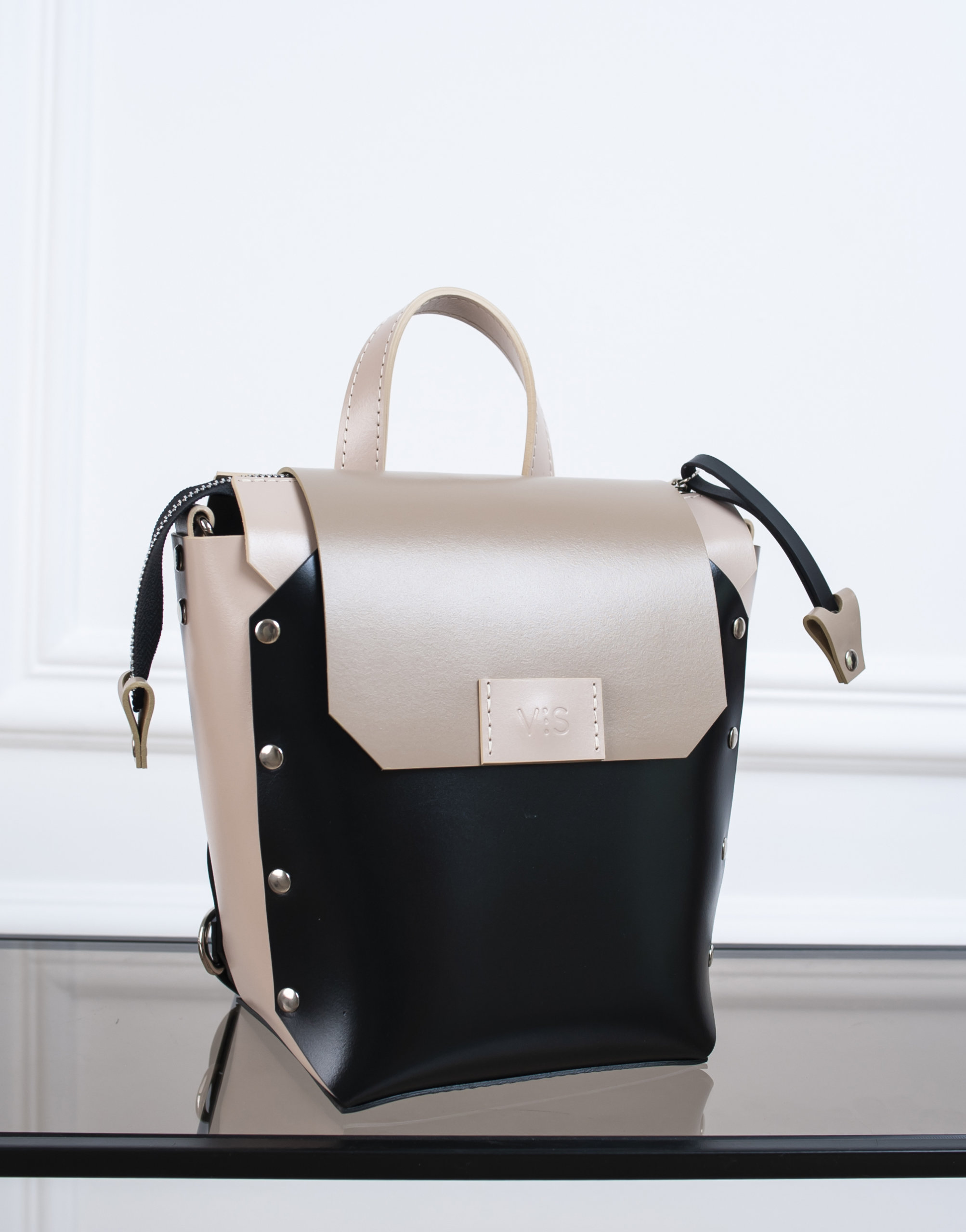 Корпус виконаний зі шкіри українського виробництва. Основне відділення закривається на кришку-клапан і магніт, а також блискавку. Усередині рюкзак має одне відділення та кишеньку з повсті. Розмір дна 15*13 см. Висота 21 см. Ширина вгорі 21 см.