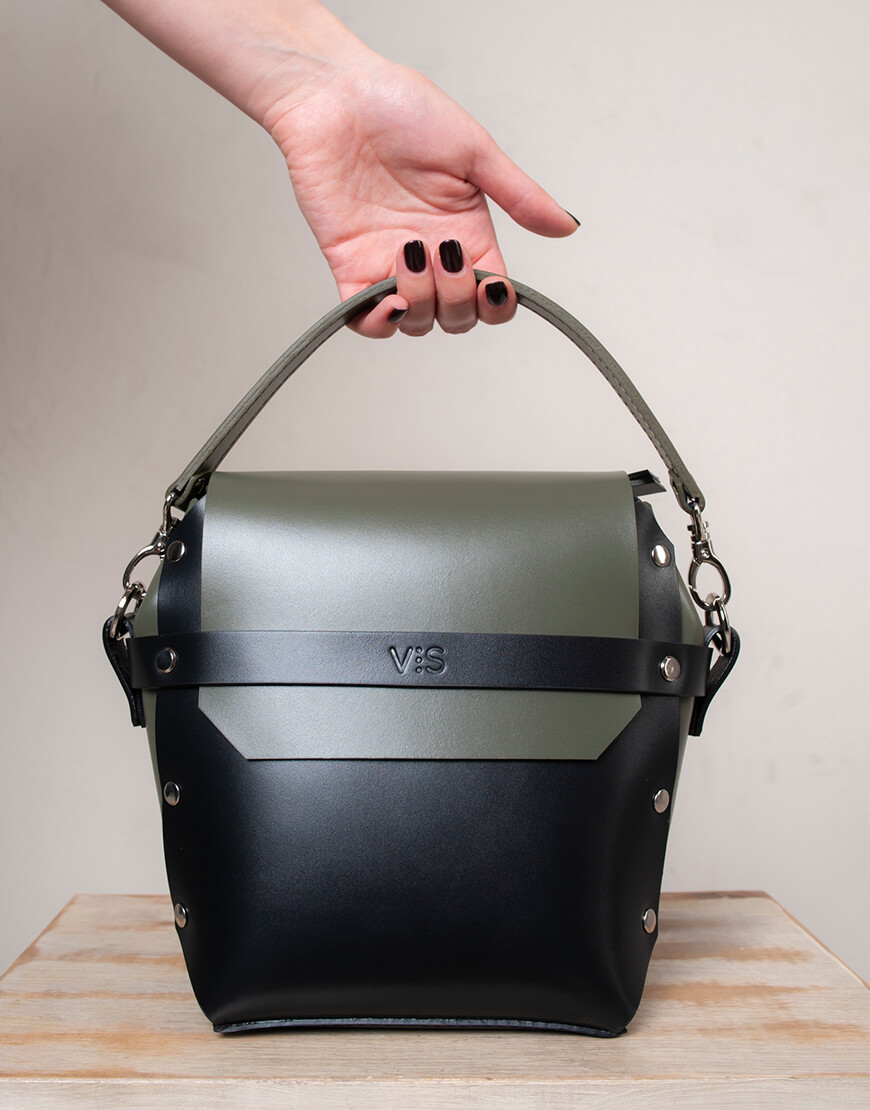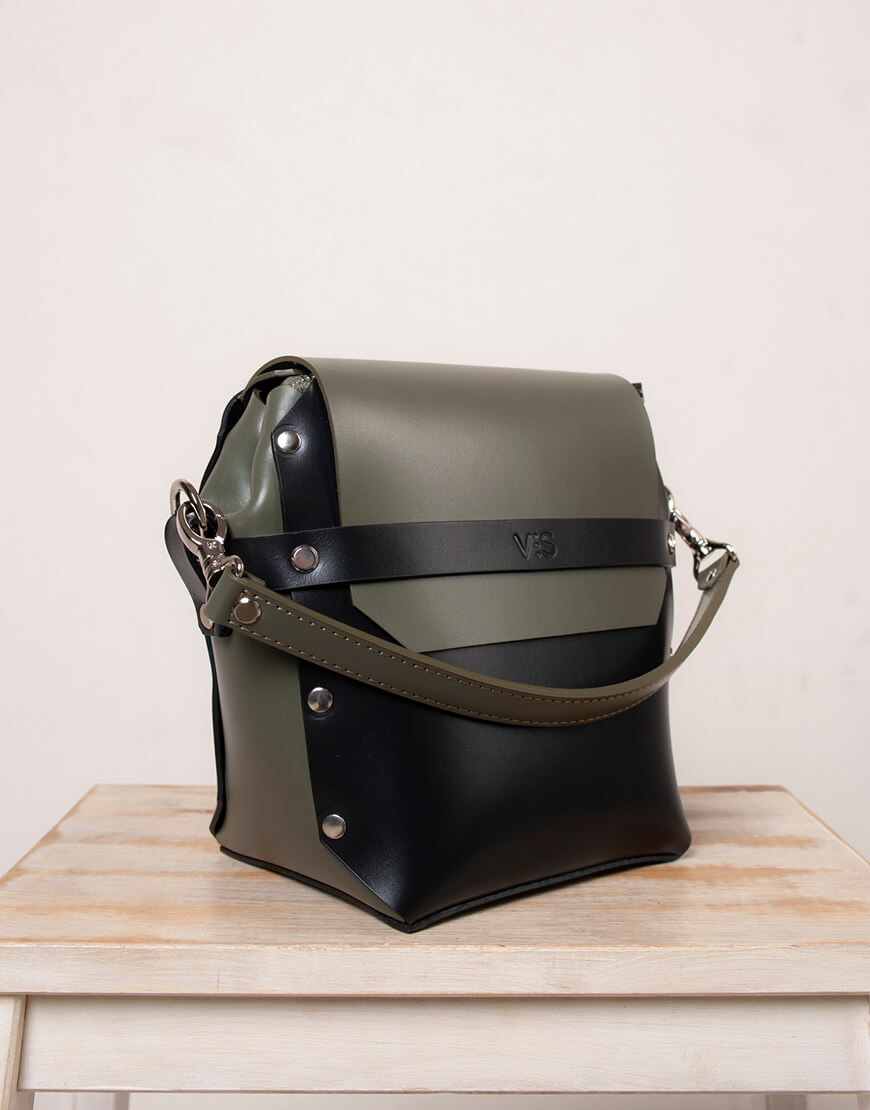 Середня, грайлива і з блискавкою. Не велика сумочка зі шкіри українського виробництва. Основне відділення закривається на кришку-клапан і блискавку. Всередині сумочки одне відділення і кишенька з повсті. Розмір дна 13*15 см. Висота 18 см. У комплекті є довга ручка.