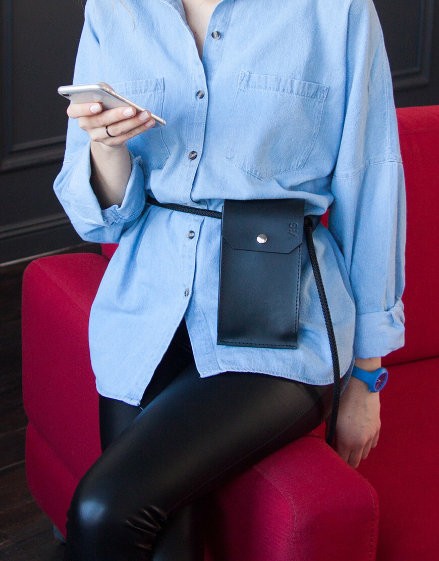 Це найзручніша сумка для телефона. Ви можете використовувати її, як основну сумку. Або як другу сумку, для носіння з рюкзаком. Ваш телефон, картки, ключі завжди будуть під рукою. Корпус виконаний зі шкіри українського виробництва. Усередині сумочки два відділення (для телефону і павербанка або для телефону і гаманця, ключів). За допомогою шнура-ручки ви можете зручно носити сумочку на талії або crossbody. Розмір 18*9 см. Ширина приблизно 3 см і може збільшуватися.