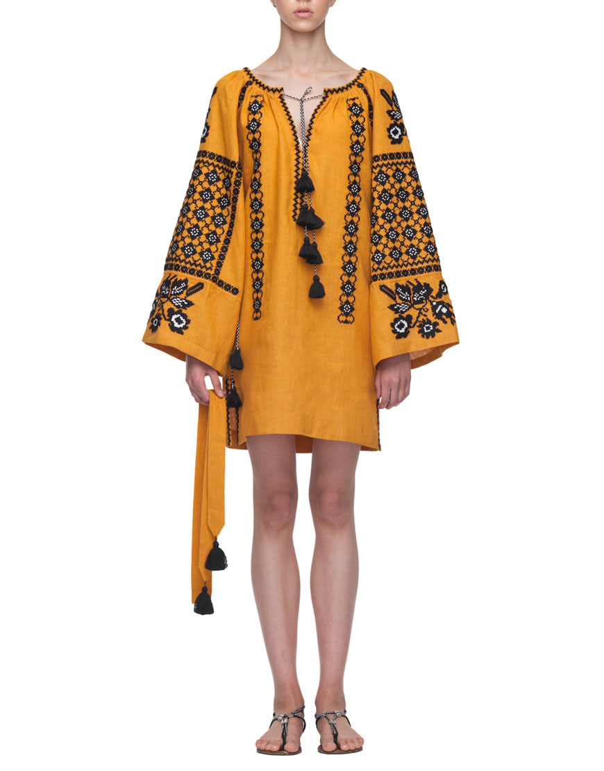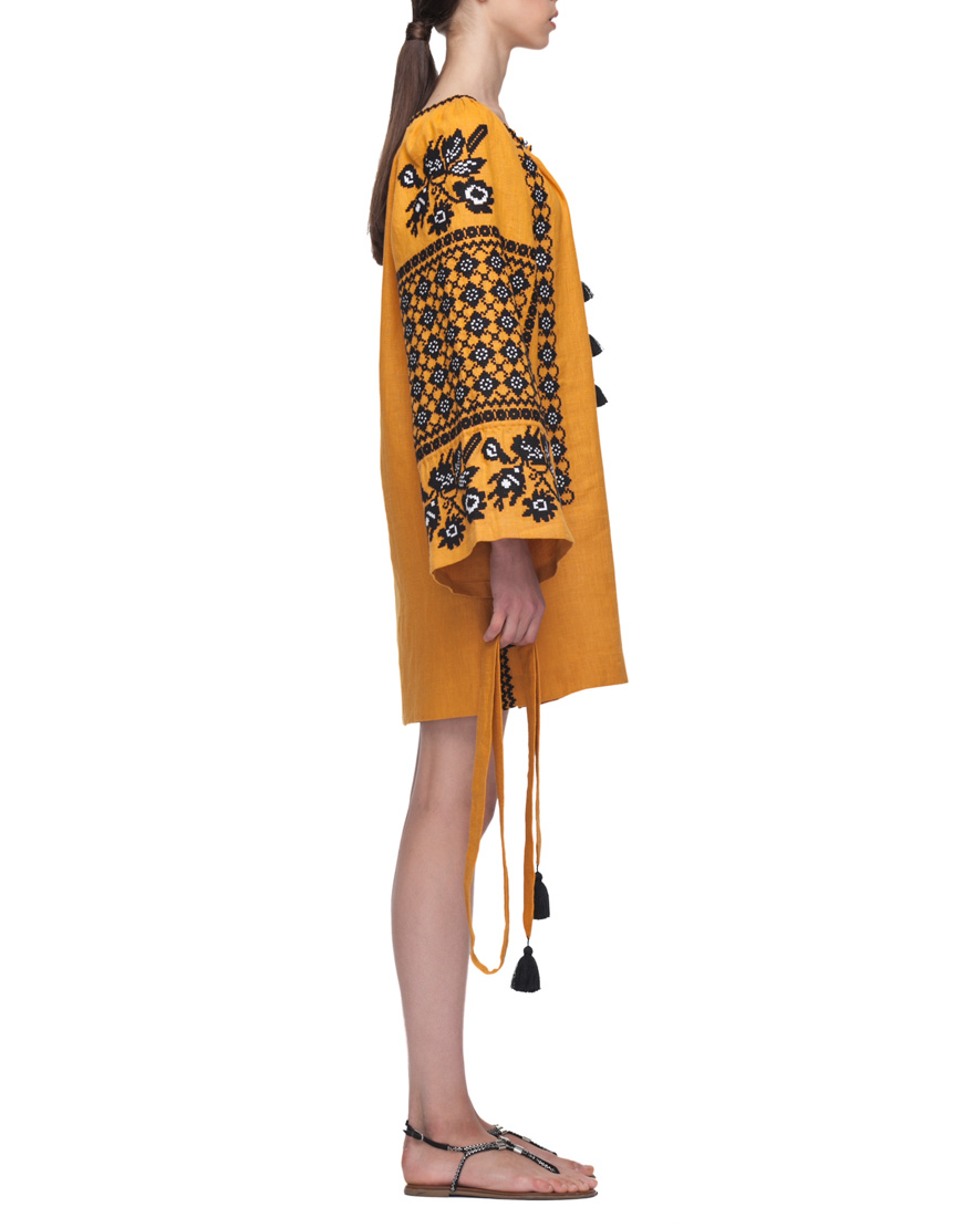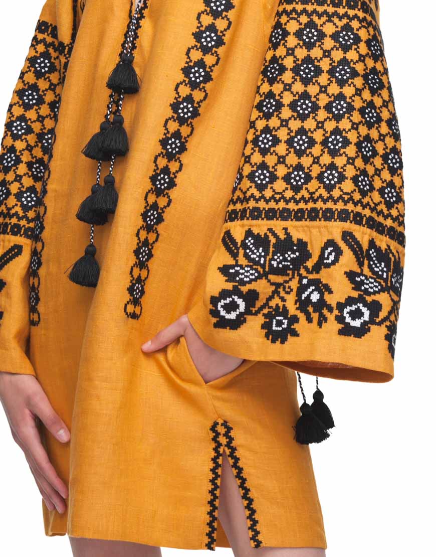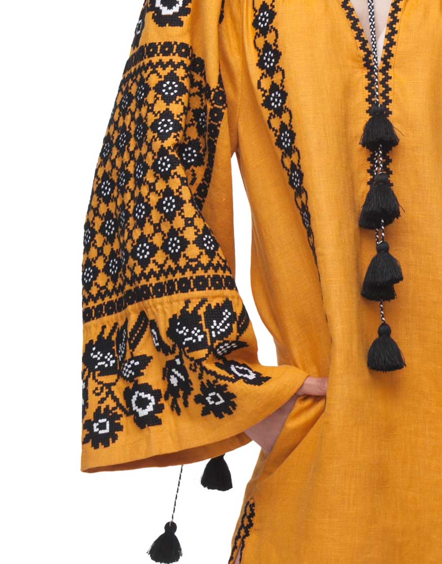 Доставка протягом 2-14 робочих днівЖіноча туніка-вишиванка «Зоряна» виконана у кольорі «охра», який уже кілька сезонів підряд є одним із наймодніших відтінків. Туніка пошита із високоякісного натурального льону. Рукави туніки щедро прикрашені вишивкою чорного та білого кольору. В основі автентичної вишивки – старовинний візерунок, характерний для Львівщини. Деталі: Рукави на зав’язках, в зоні передпліччя оздоблені вишивкою. Горловина прикрашена зав’язками з кісточками , розрізи у бокових швах. У комплекті до туніки передбачено пояс. Символіка вишивки: Жовтий колір в українській культурі символізує золоте сонце, краплі запашного меду та є символом достатку; чорний колір символізує родючість землі, щедрість природи та сімейний достаток; білий колір символізує невинність, чистоту та непорочність.