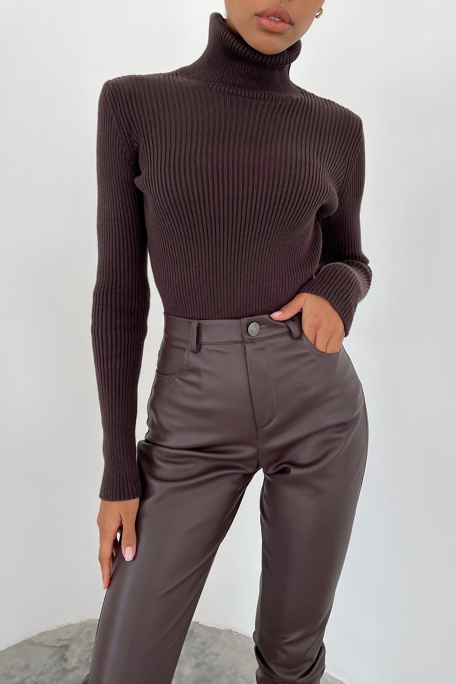 ДоставкаЖіноча трикотажна водолазка шоколадного кольору.