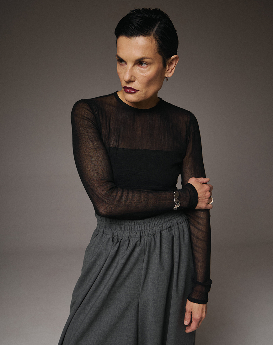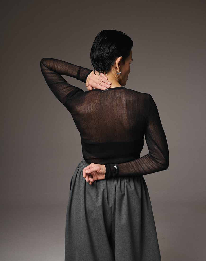 Створений з обтислим скульптурним кроєм, лонгслів рухається разом із вами — ідеально самостійно або як вишуканий базовий шар під піджаки чи верхній одяг. Мінімалістичний силует і приємна на дотик текстура роблять його універсальним елементом для повсякденного стильного носіння.
