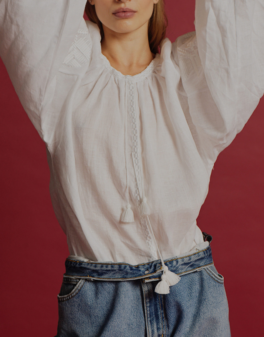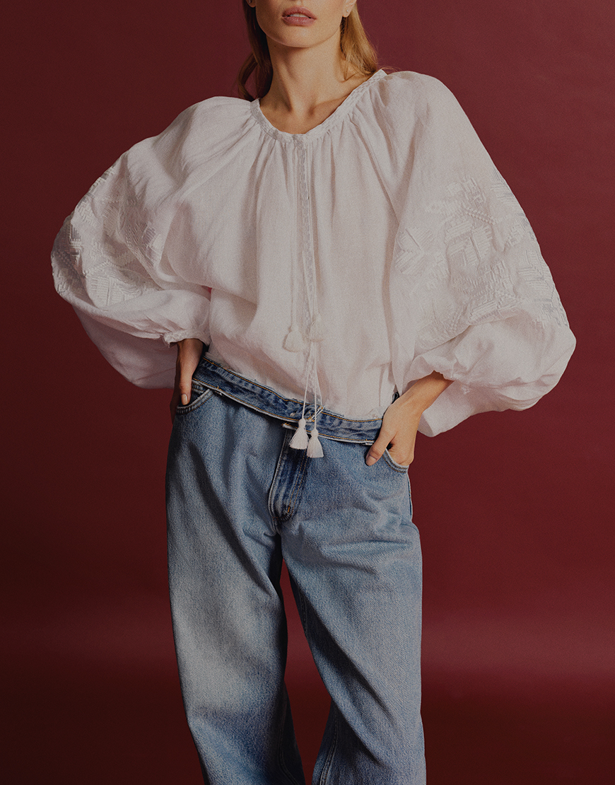 Царська квітка у виконанні білим по білому вимальовується своїми стібками по рукавах. В давнину так білим по білому вишивали до свят особливих або для особливих подій — «у світлу долю».