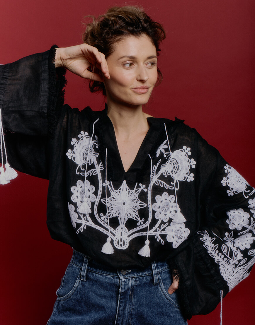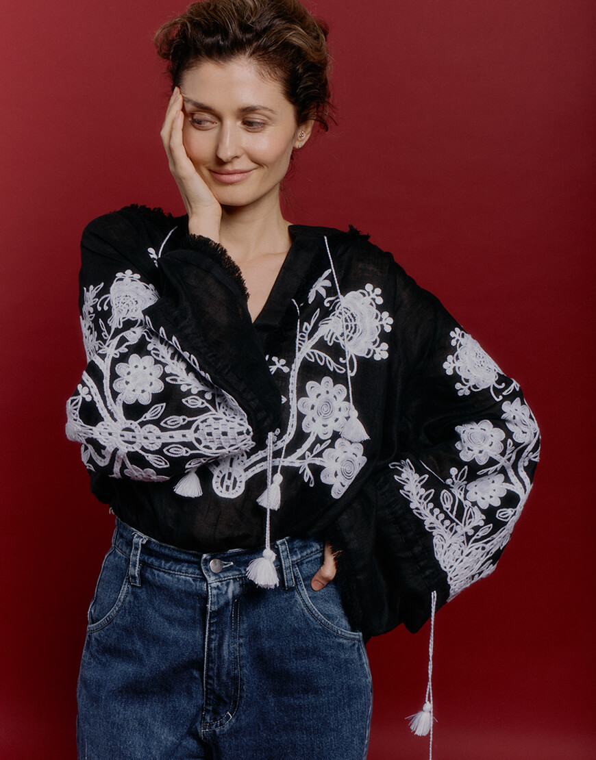 Доставка впродовж 5-7 робочих днівЧорна сорочка з білою вишивкою. Має ширші рукави до низу з красивими випущеними нитками та оригінальний комір.