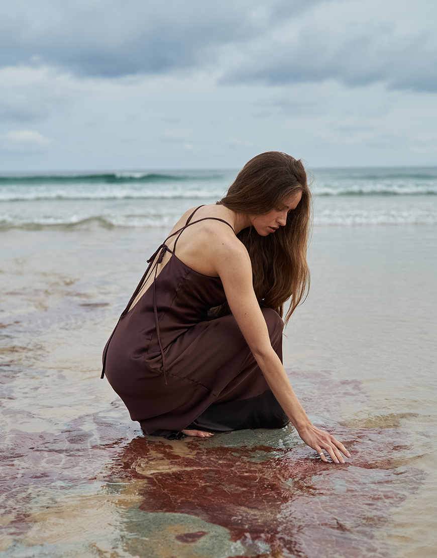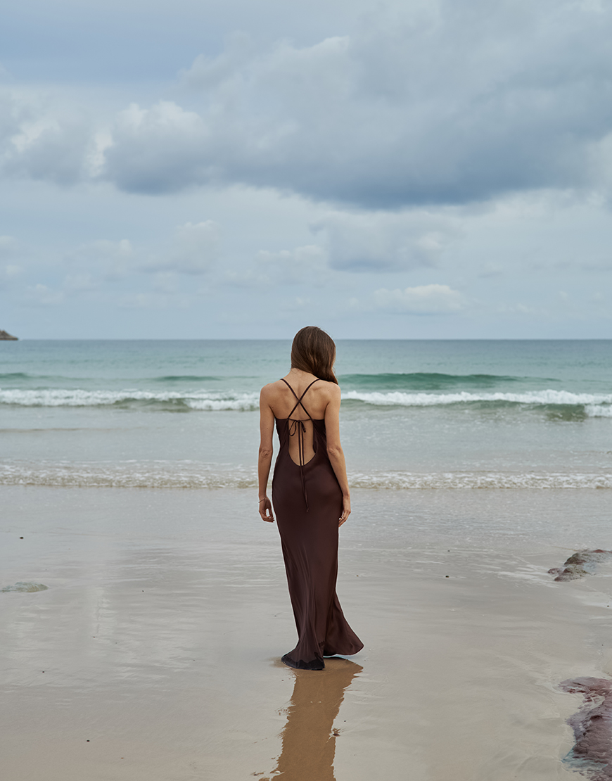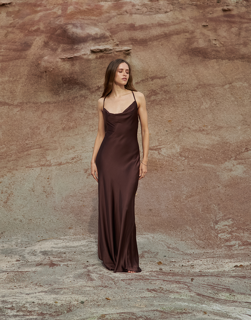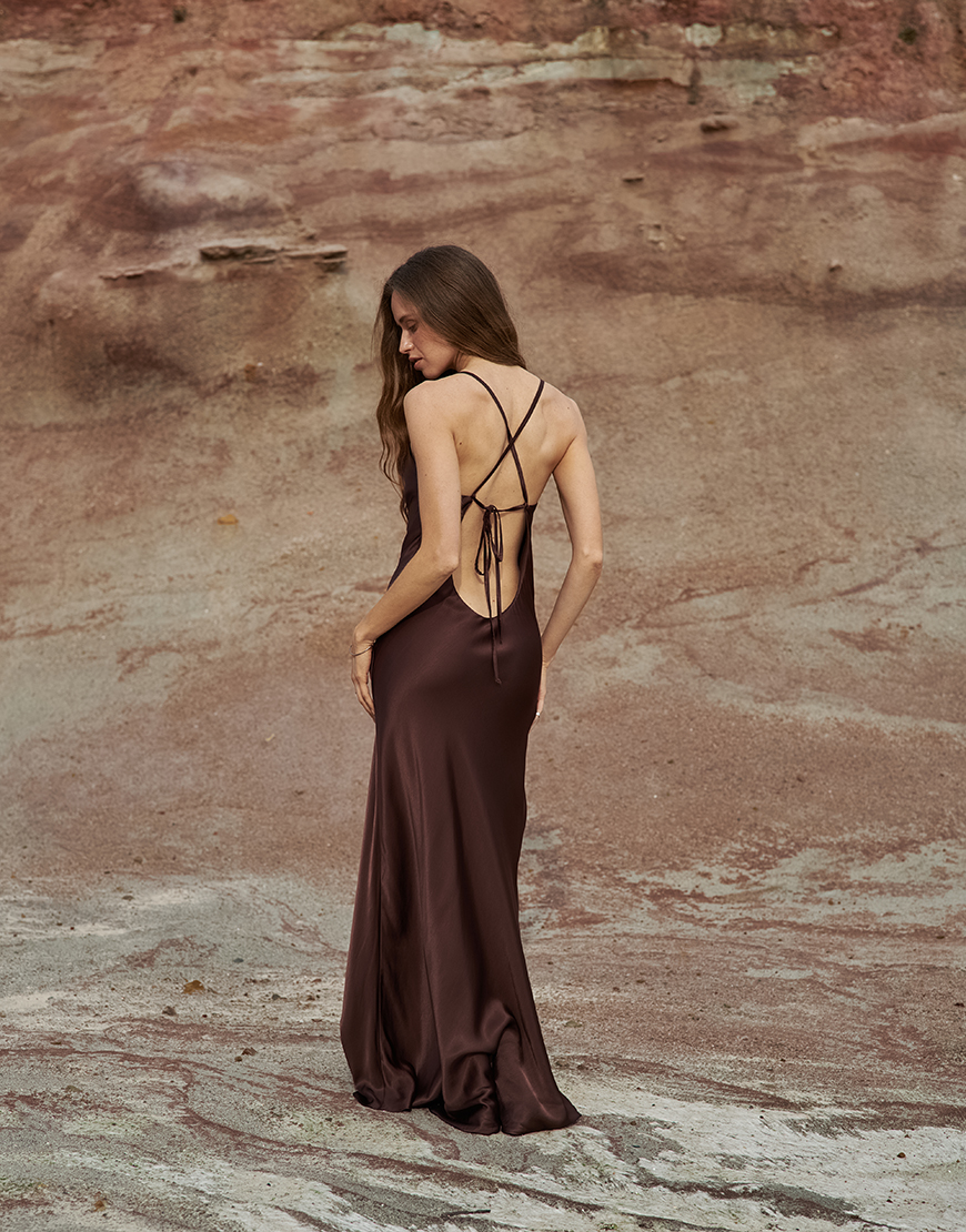 Надтонка та надлегка віскозна сукня з відкритою спиною, бездоганно лягає по фігурі завдяки косому крою та стримуючим властивим