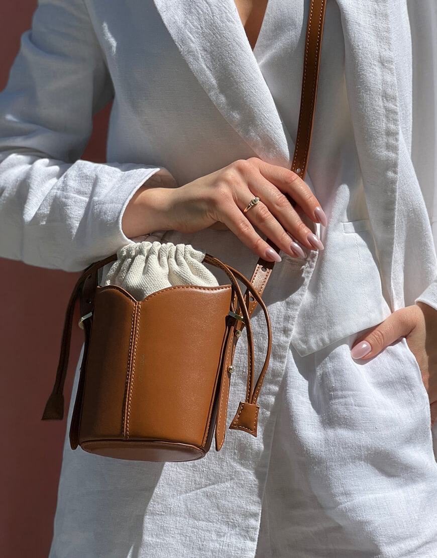 Маленька сумка-відро від VIKELE STUDIO з фірмовими елегантними вирізами та елегантною формою