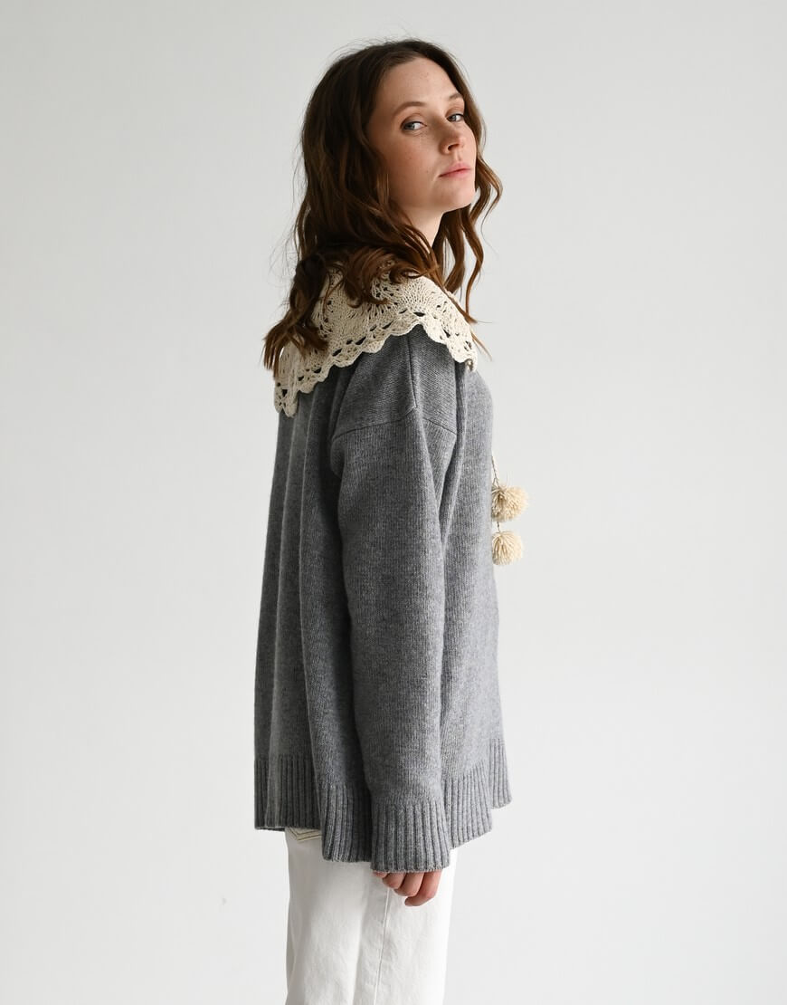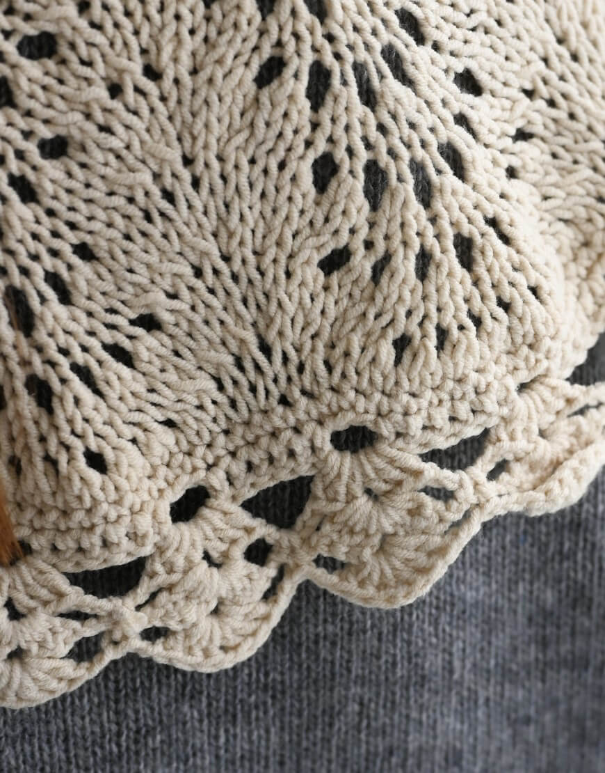 Комірець зі 100% бавовни виконаний у бежевому кольорі. Посадка регулюється за допомогою зав’язок з помпонами.