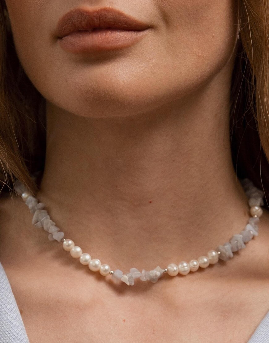 Кольє представлене у блакитному кольорі. Прикраса дуже гарна, виконана з натуральних мінералів та річних перлів. Фурнітура виготовлена зі срібла 925 проби.