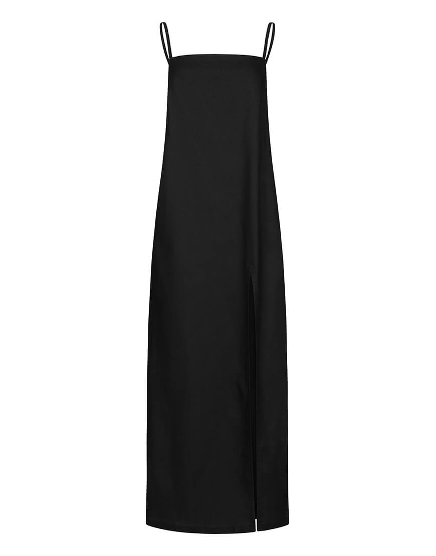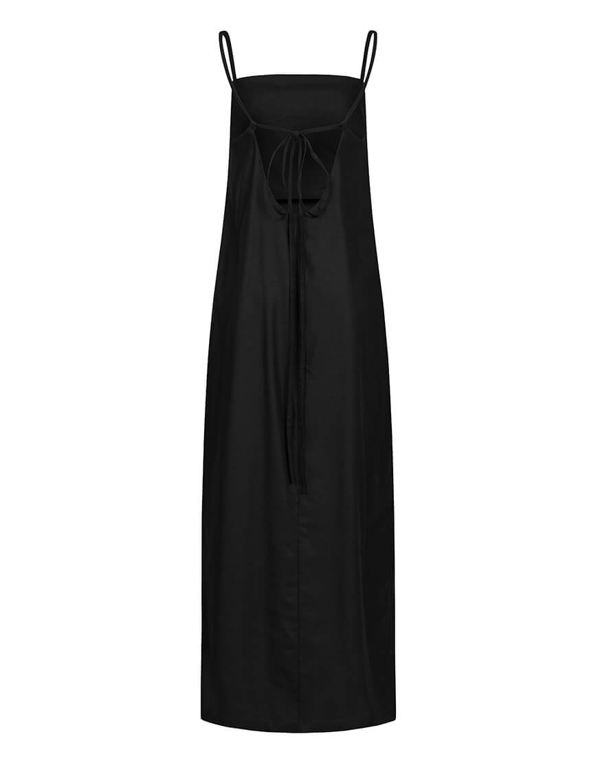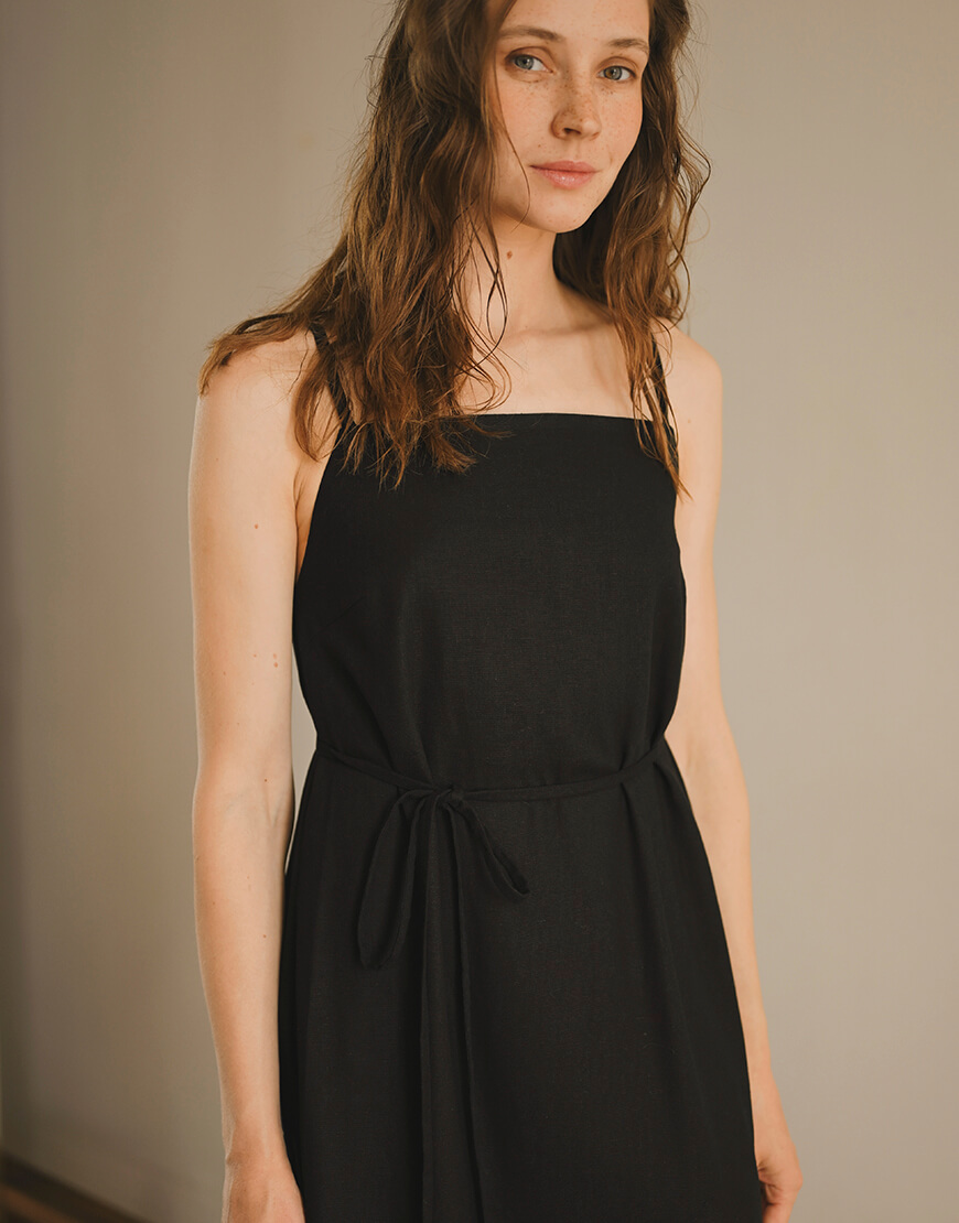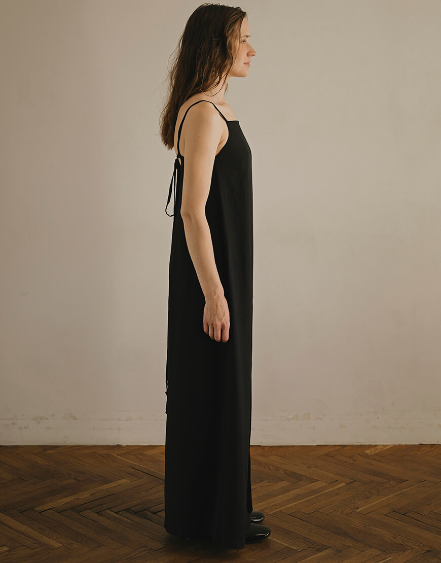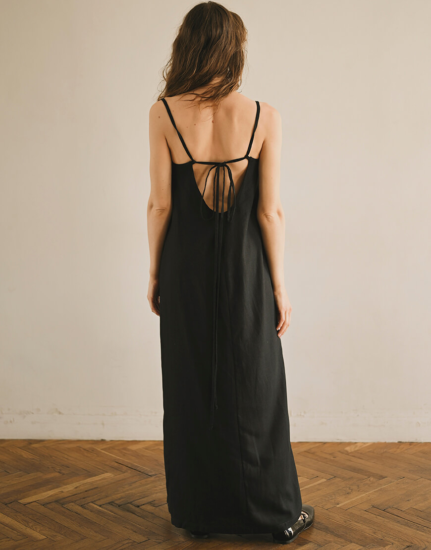Доставка впродовж 5-14 робочих днівСукня з льону та віскози у довжині максі виконана у чорному кольорі. Тканина дуже м‘яка, приємна до тіла та легка. Сукня тримається на тонких бретелях. Посадка сукні регулюється за допомогою зав’язок.