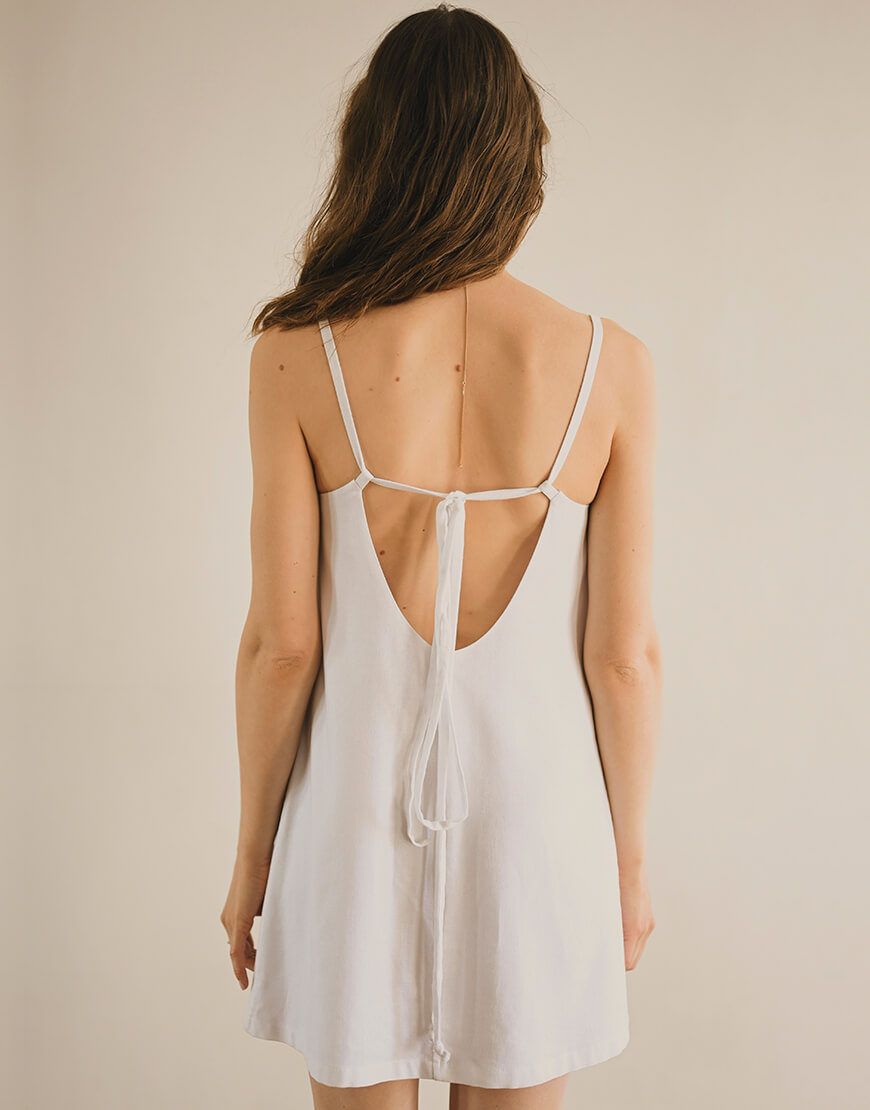 Сукня з льону та віскози у довжині міні виконана у білому кольорі. Тканина дуже м‘яка, приємна до тіла та легка. Сукня тримається на тонких бретелях. Посадка сукні регулюється за допомогою зав’язок.
