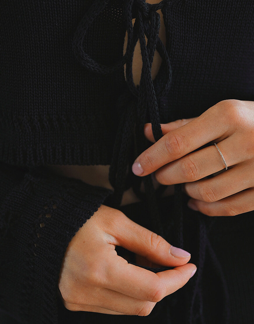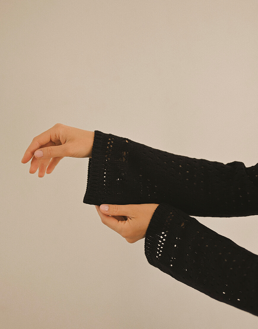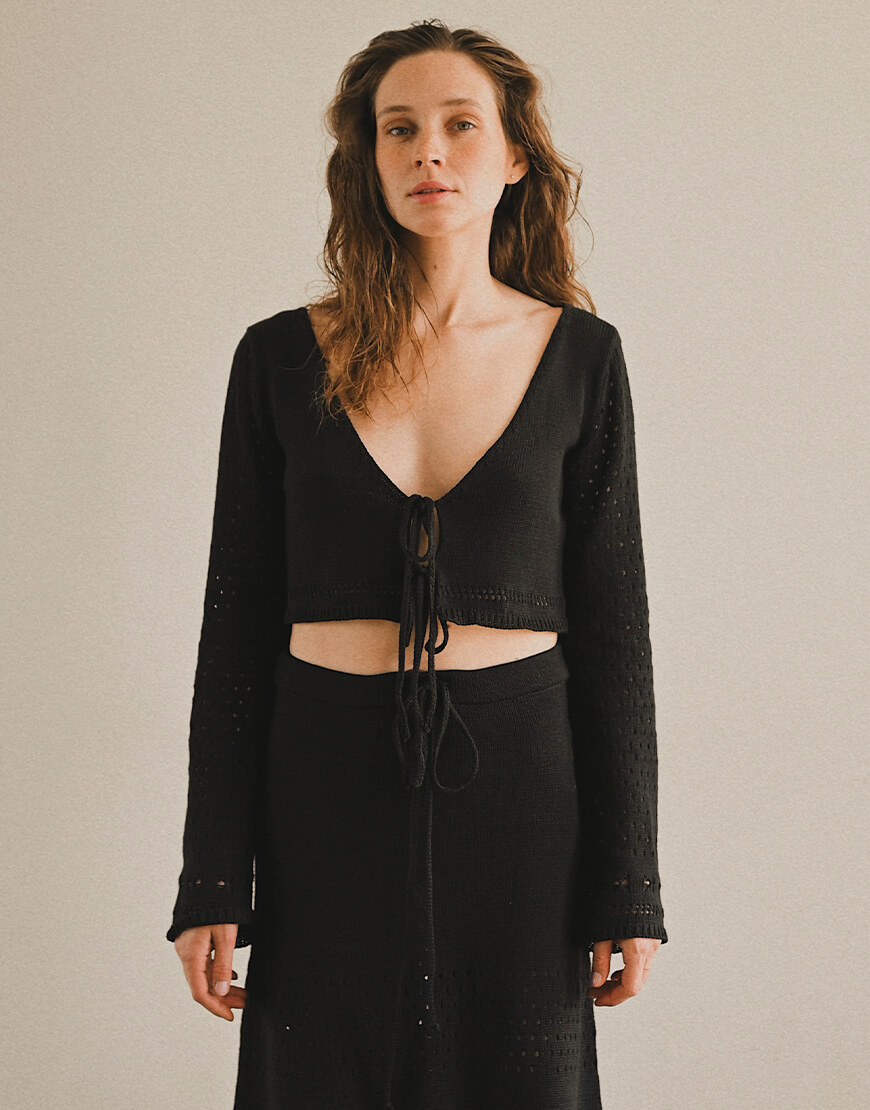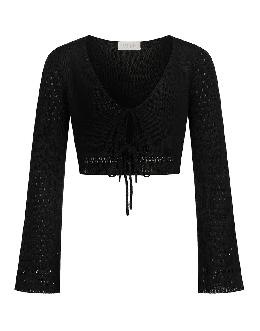 Топ зі 100% бавовни виконаний у чорному кольорі. Тканина приємна до тіла, комфортна у носінні та не парка. Довгі рукави прикрашені ажурними візерунками. Топ зав’язується на грудях.