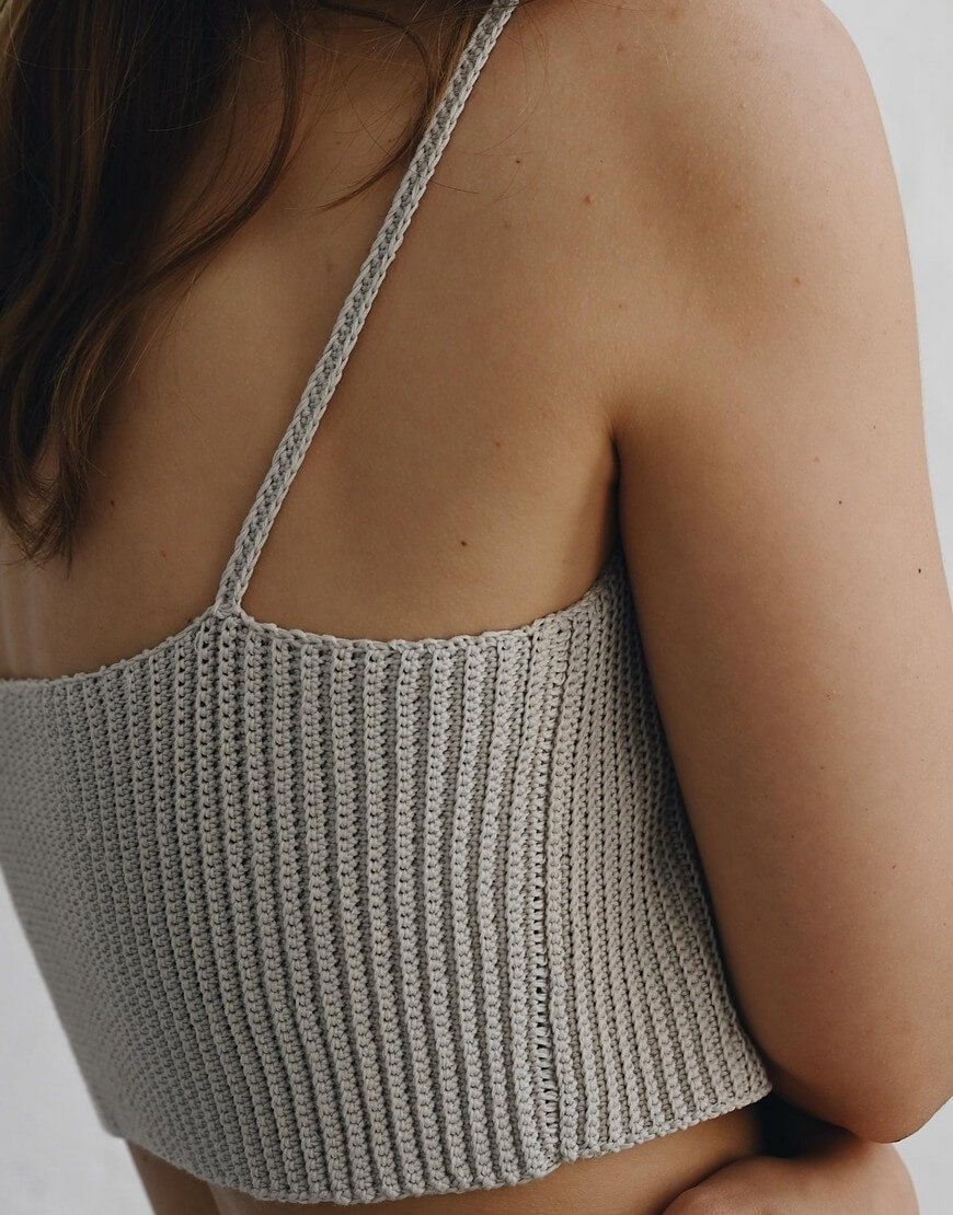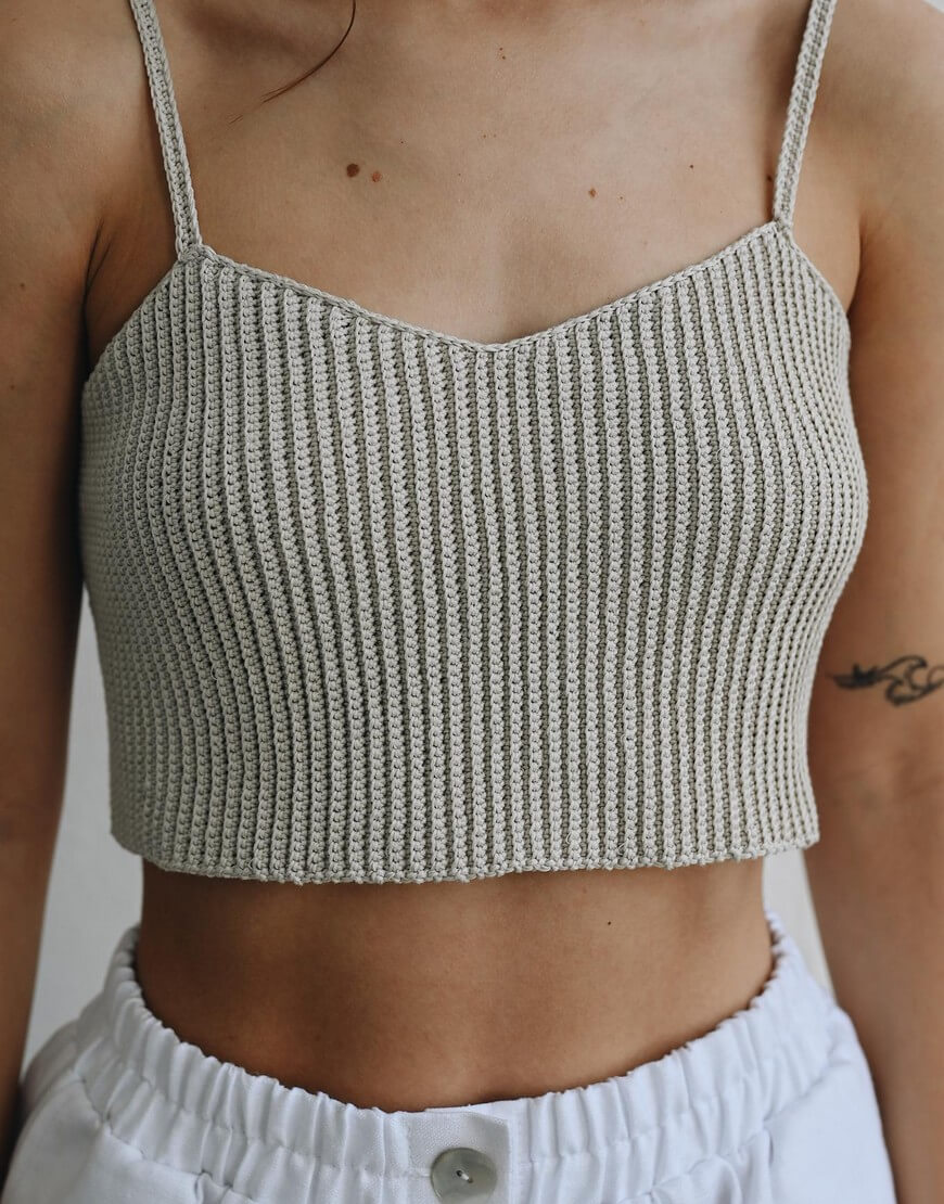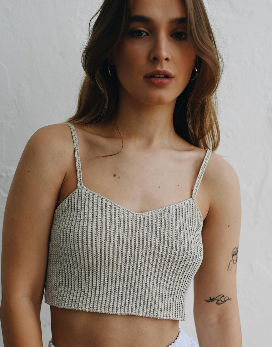 Топ зі 100% бавовни виконаний у бежевому кольорі. Матеріал приємний до тіла та дуже комфортний у носінні. Топ має тоненькі бретельки. Ця модель має вкорочений крій.