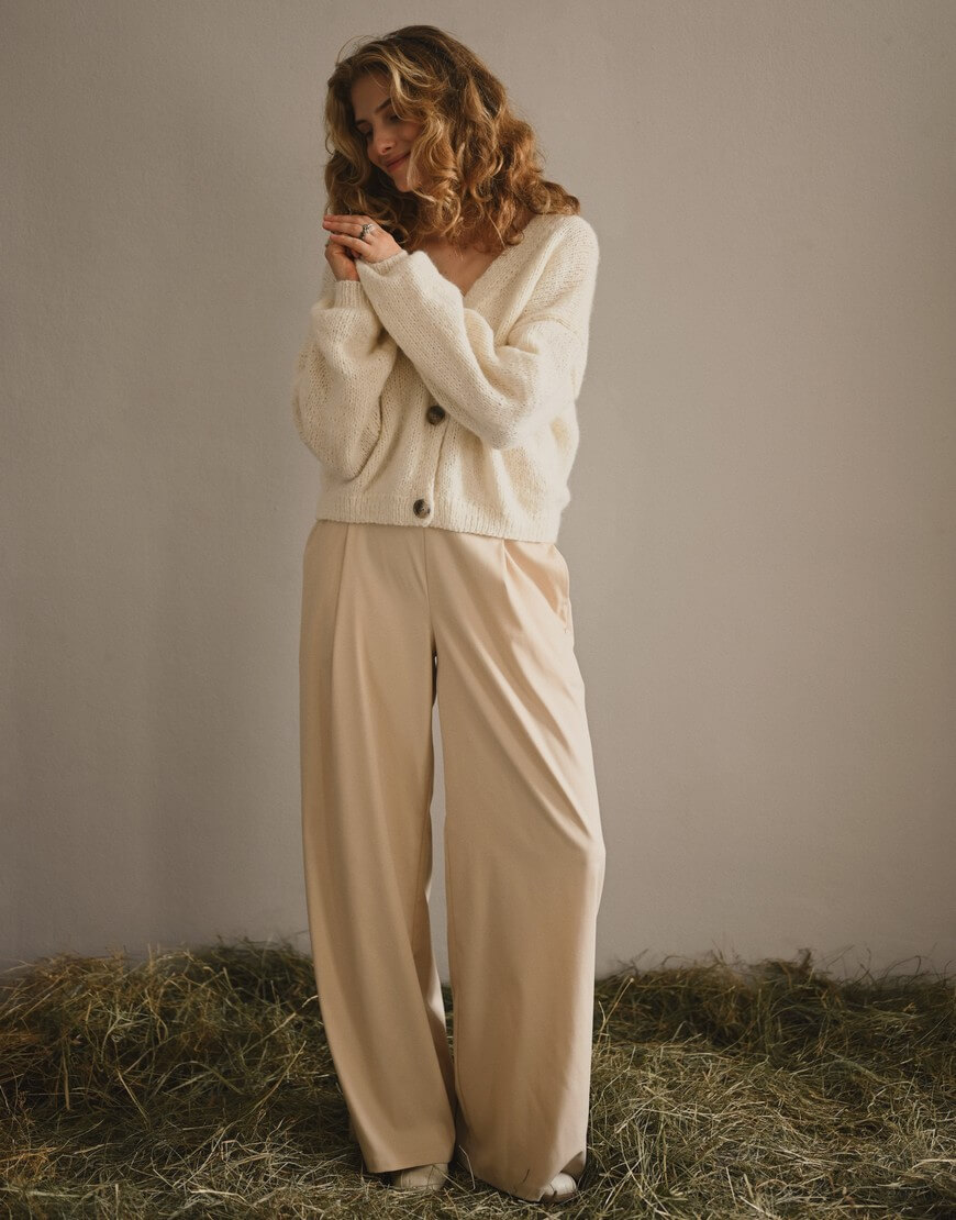 Кардиган з вовни альпаки та мериносу виконаний у молочному кольорі. Виріб дуже приємний до тіла, теплий та комфортний у носінні. Модель оздоблена ґудзиками.