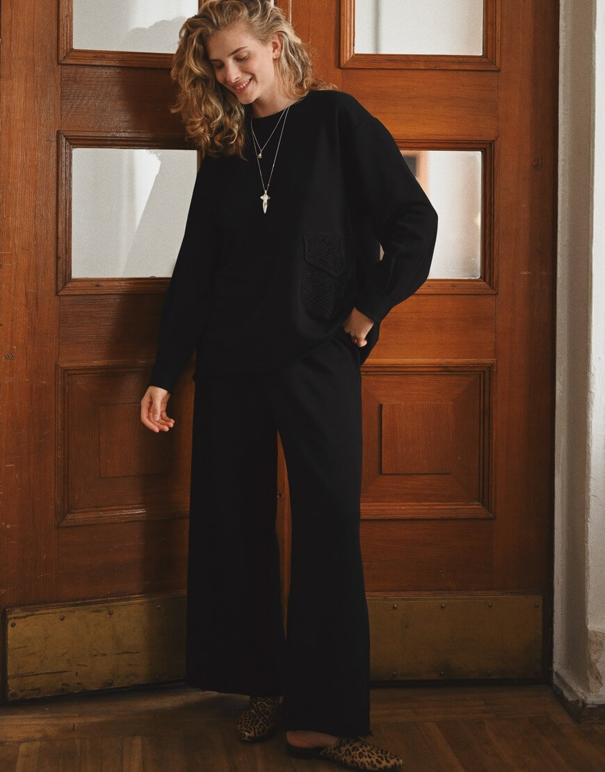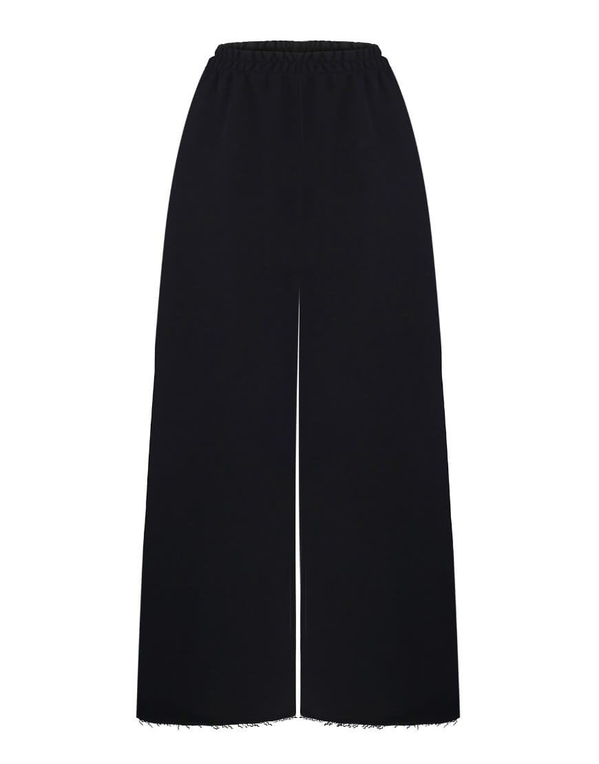 Штани зі 100% бавовни виконані у чорному кольорі. Тканина дуже м‘яка та приємна до тіла, комфортна у носінні. На талії є резинка, яка допомагає регулювати посадку.