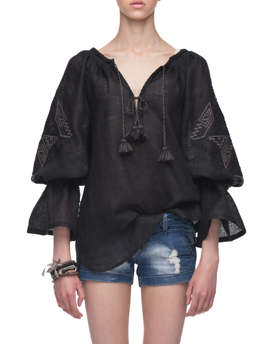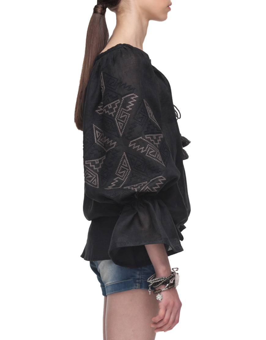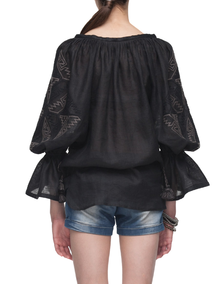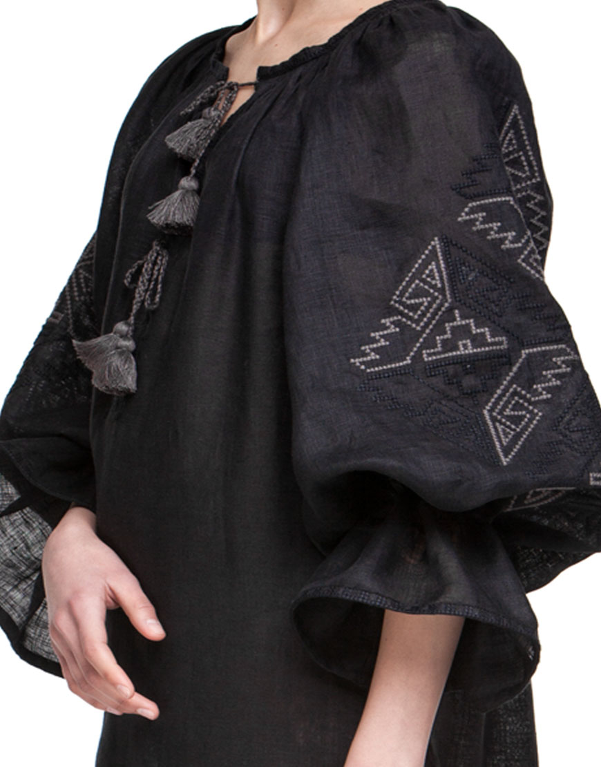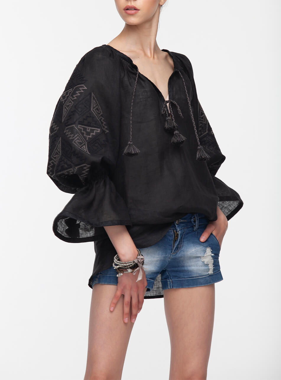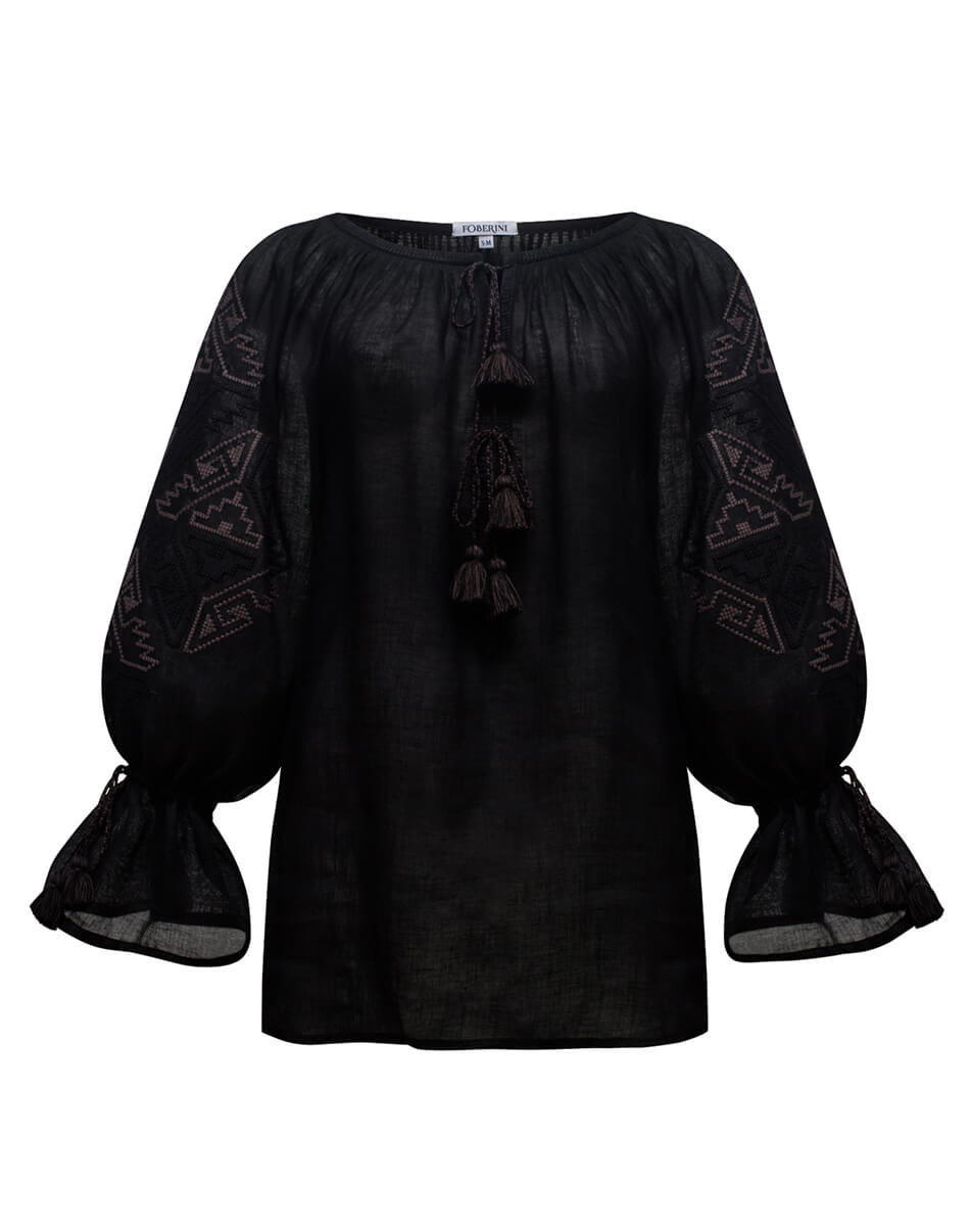 Доставка протягом 2-14 робочих днівВишиванка від Foberini чорного кольору з автентичним українським орнаментом з Івано-Франківської області. Геометричний орнамент виконаний чорними нитками по чорнії тканині. Рукава доповнюють волани, які затягуються кісточками з бахромою. Вишиванка виконана з тонкого натурального льону, що дозволить комфортно себе відчувати навіть у найспекотніший літній сезон. Ця вишиванка підійде як для офісного стилю, так і вбрання в стилі casual. Пишні рукава можна носити як затягнутими на зав’язках, так і у вільному прямому вигляді.