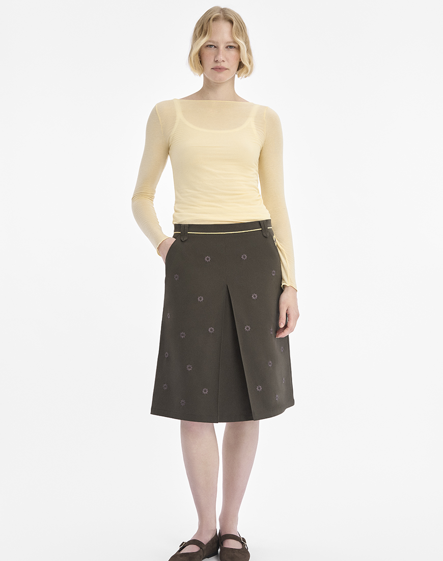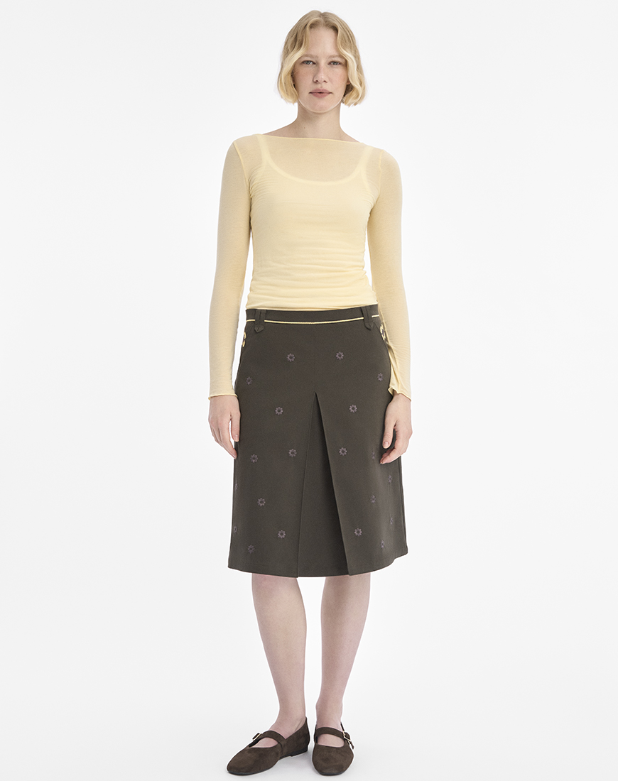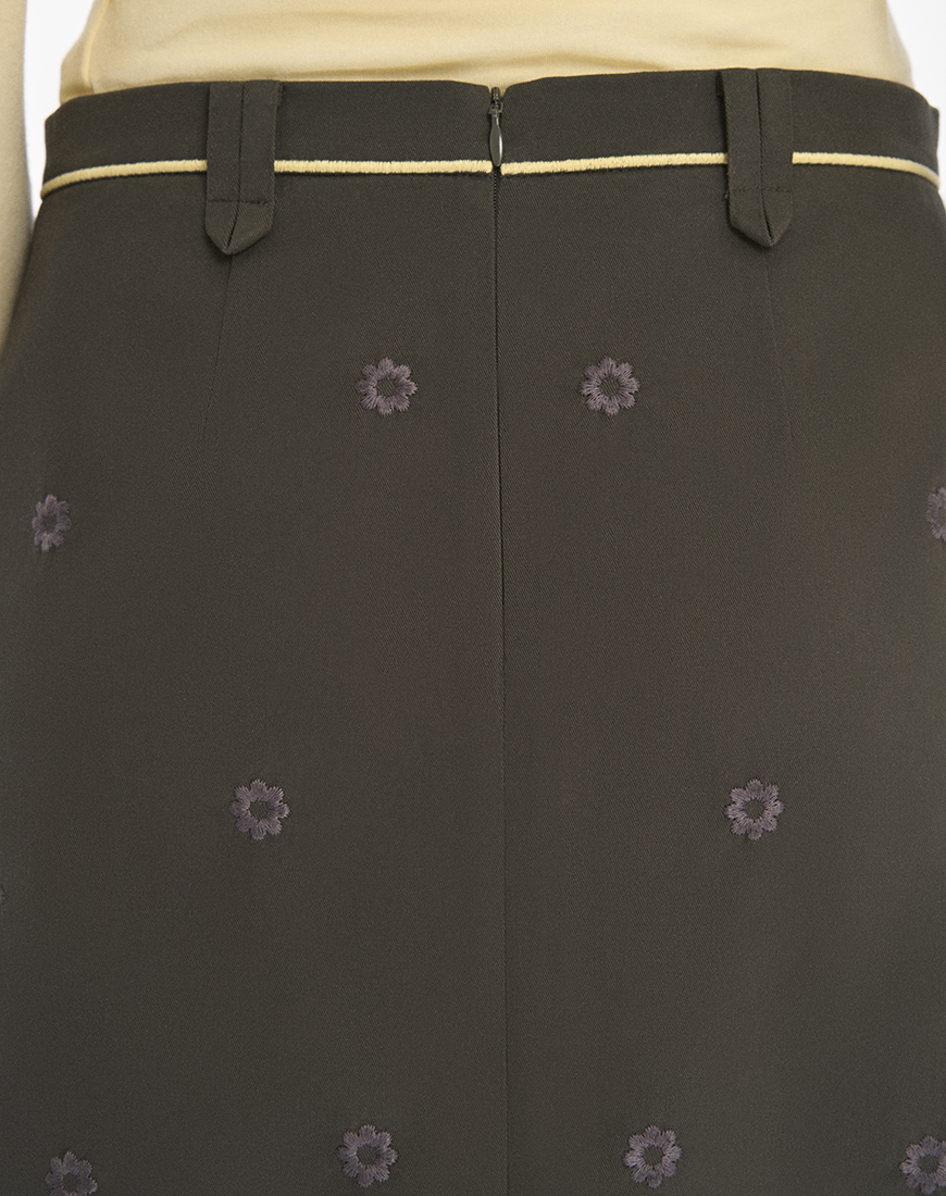 Спідниця розшита флористичним орнаментом. Ніжно-жовті квіти розміщені по обидва боки біля кишень. А дрібніші квіти графітового кольору розсипані по всій довжині виробу. Вишита лінія на поясі імітує тонкий пасок.