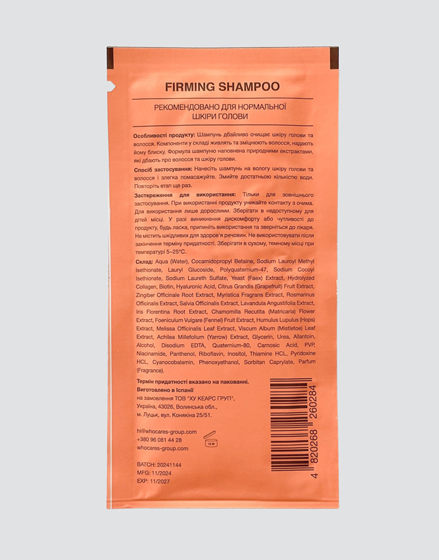 Aqua, Cocamidopropyl Betaine, Sodium Lauroyl Methyl Isethionate, Lauryl Glucoside, Polyquaternium-47, Sodium Cocoyl Isethionate, Sodium Laureth Sulfate, Yeast Extract, Hydrolyzed Collagen, Biotin, Hyaluronic Acid, Citrus Grandis Fruit Extract, Zingiber Officinale Root Extract, Myristica Fragrans Extract, Rosmarinus Officinalis Extract, Salvia Officinalis Extract, Lavandula Angustifolia Extract, Iris Florentina Root Extract, Chamomilla Recutita Flower Extract, Foeniculum Vulgare Fruit Extract, Humulus Lupulus Extract, Melissa Officinalis Leaf Extract, Viscum Album Leaf Extract, Achilea Millefolium Extract, Glycerin, Urea, Allantoin, Alcohol, Disodium EDTA, Quaternium-80, Carnosic Acid, PVP, Niacinamide, Panthenol, Riboflavin, Inositol, Thiamine HCL, Pyridoxine HCL, Cyanocobalamin, Phenoxyethanol, Sorbitan Caprylate, Parfum.