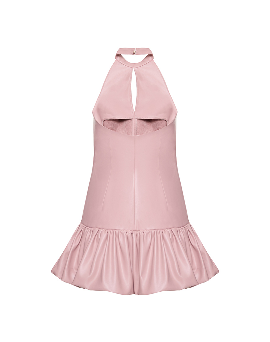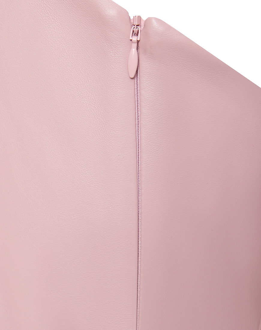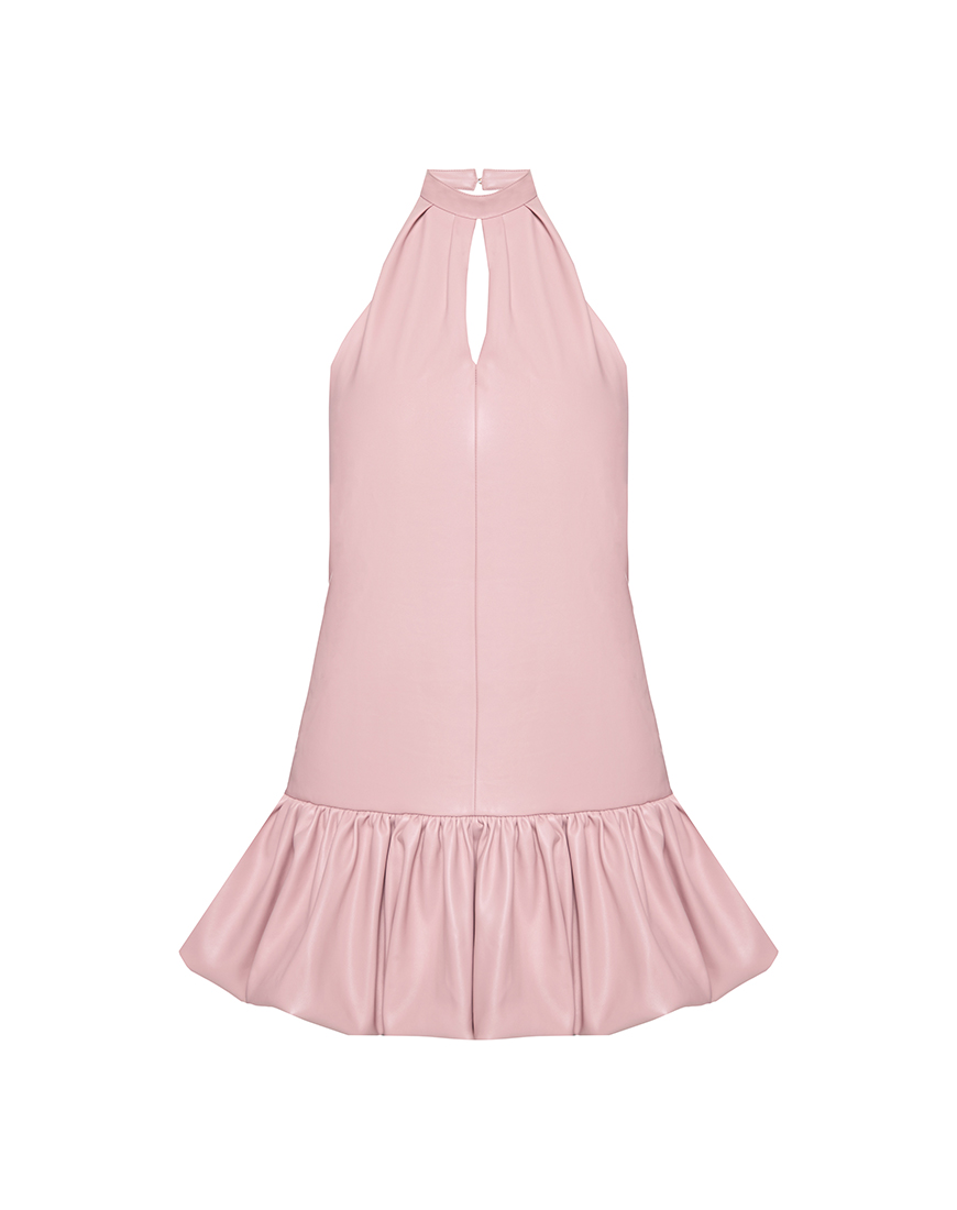 Доставка впродовж 2-9 робочих днівМінісукня з еко-шкіри ніжно-рожевого кольору з високою горловиною, вирізом-щілинкою спереду та об’ємним воланом по низу. Вона створює виразний, але водночас жіночний силует і ідеально підходить для вечірніх виходів.