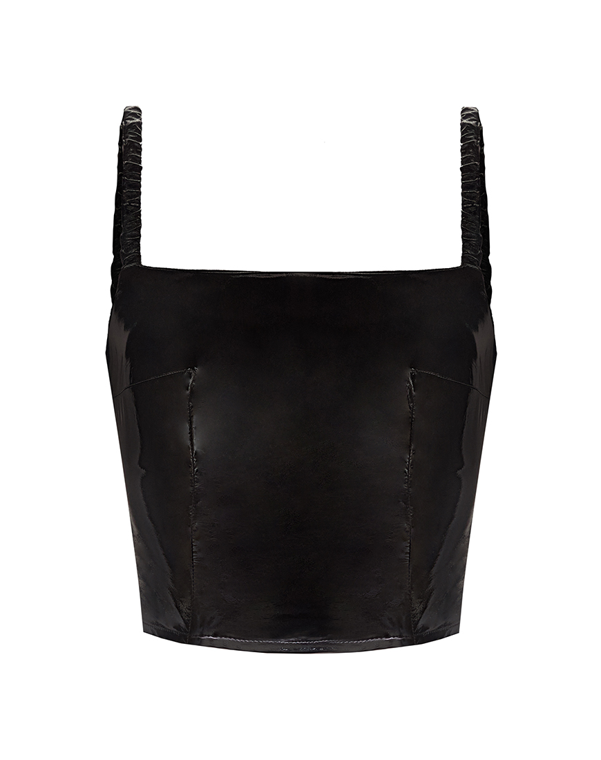 Доставка впродовж 2-9 робочих днівЧорний латексний топ-бюстьє, який щільно облягає фігуру й виразно підкреслює лінію грудей та талії. Його можна носити як зі спущеними бретелями для більш сміливого, вечірнього образу, так і в класичному варіанті – створюючи чистий, графічний силует. Ідеально поєднується з брюками, джинсами або спідницями з високою талією, додаючи будь-якому smart-casual чи party-луку нотку драматичності.