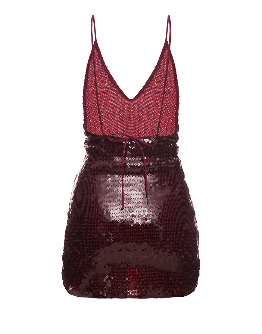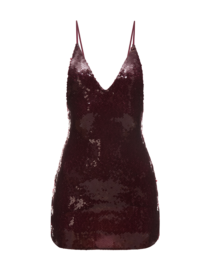 Бордові паєтки, тонкі бретелі й силует, що тримає інтригу. Ця сукня не про вечір – вона сама і є вечір: яскрава, легка, впевнена. Вона створена, щоб ловити світло й увагу без зайвих слів.