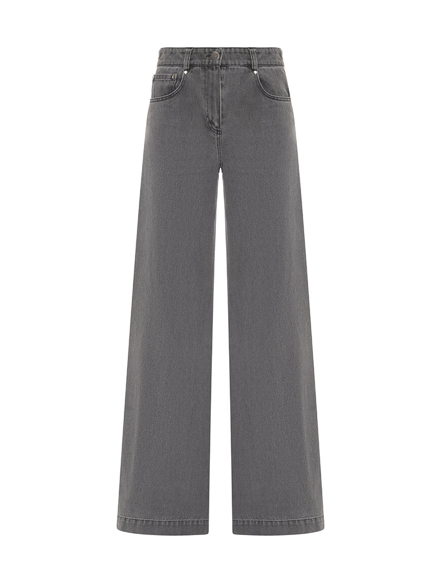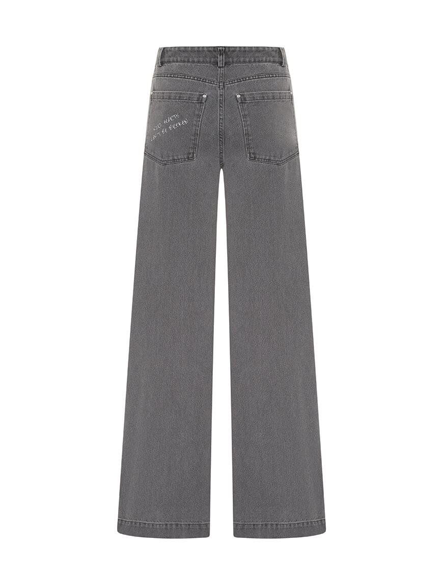 Джинси прямі, на завищеній посадці, з сірого деніму та з написом на кармані ззаду.