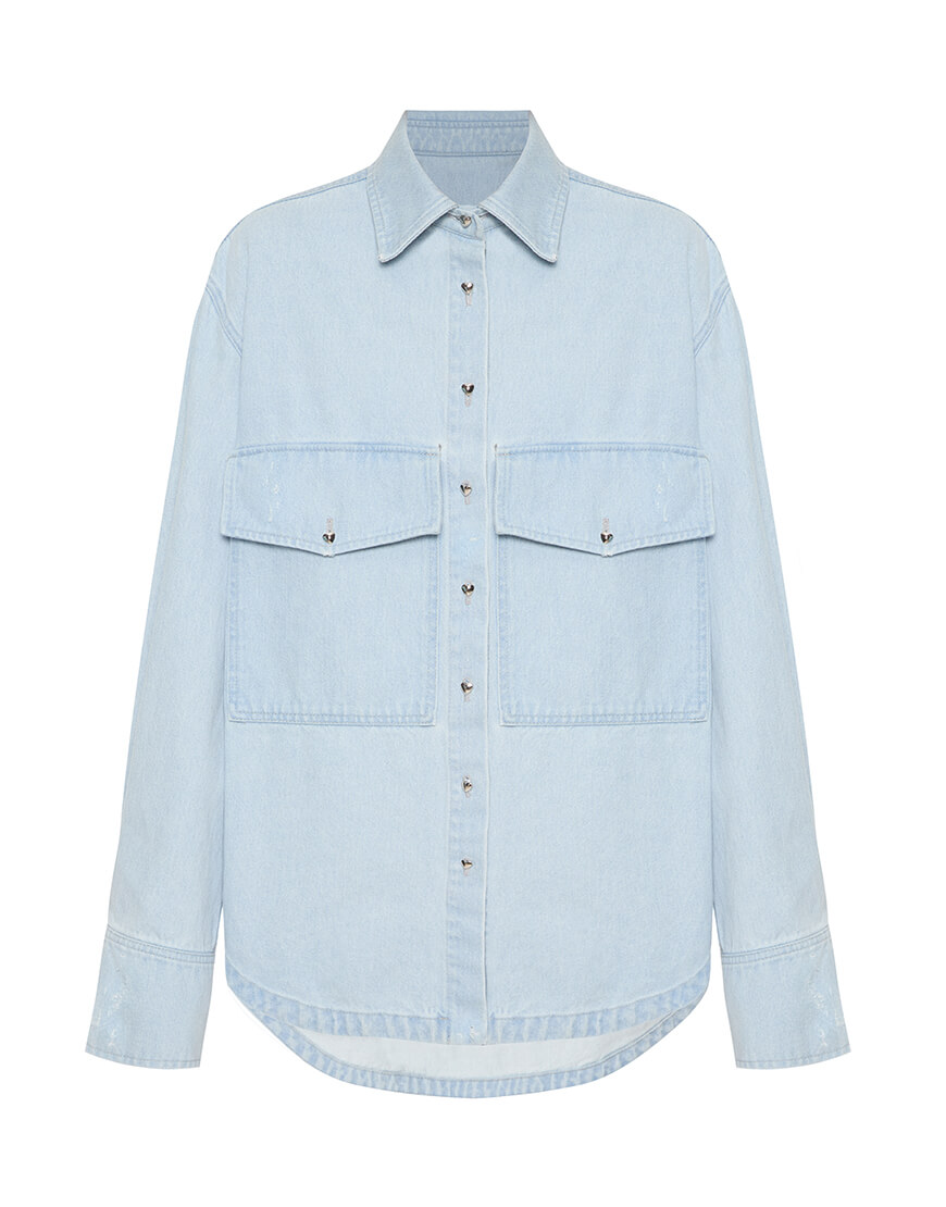 Сорочка з довгим рукавом із блакитного деніму. З переду по центру розміщено дві кишені; Ззаду в верхній частині розташоване