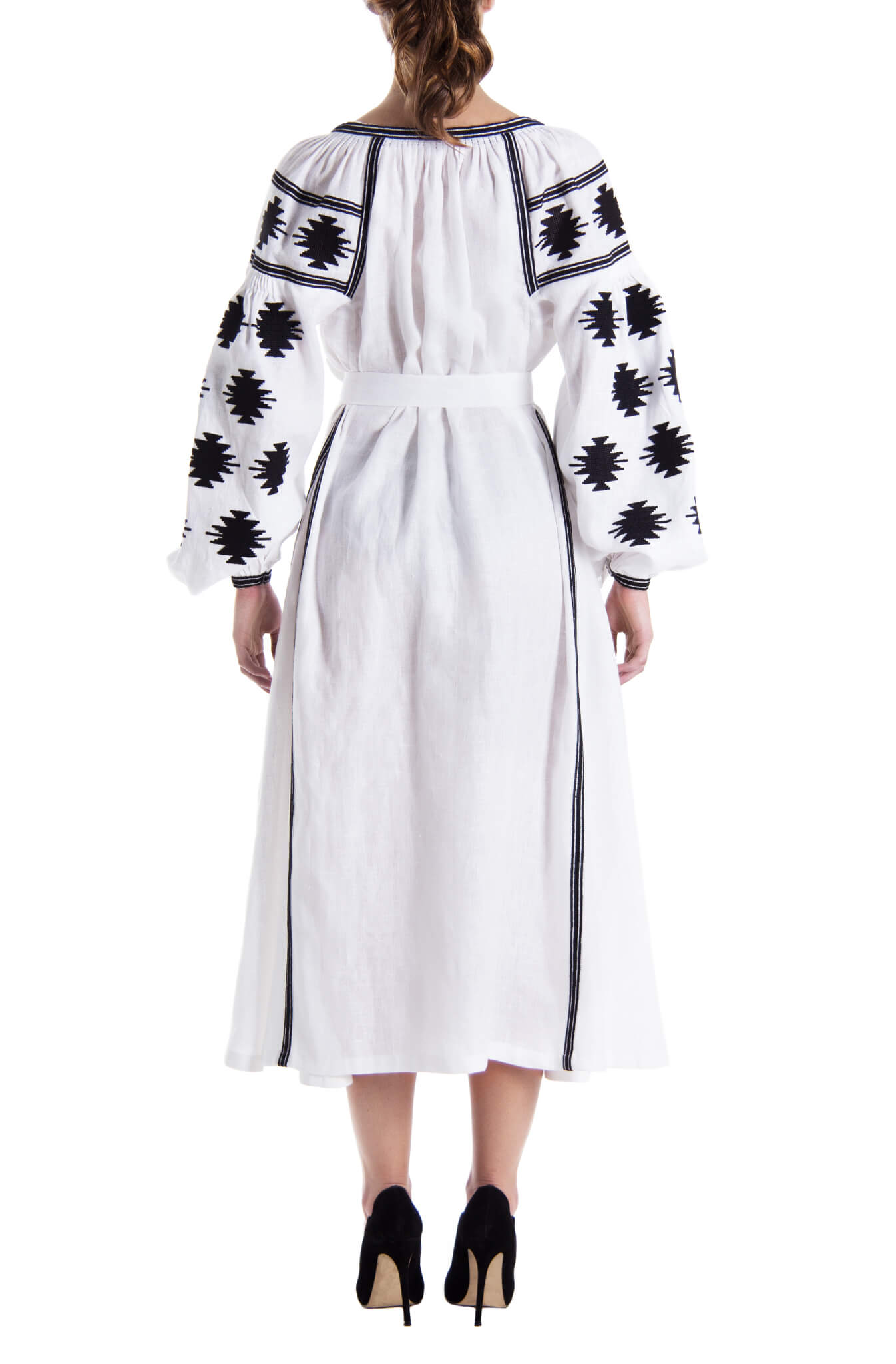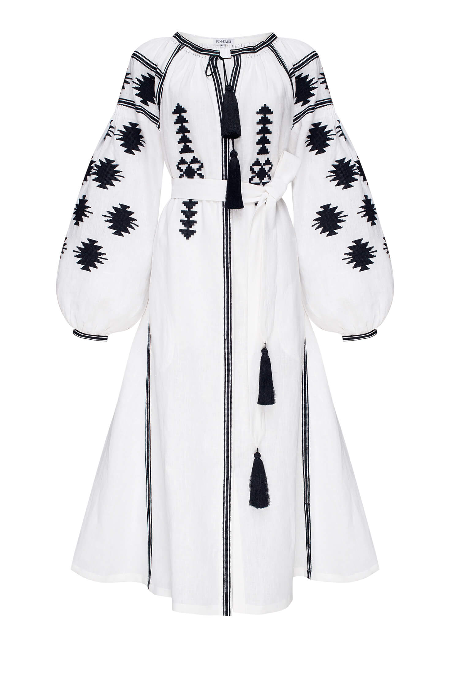 Доставка протягом 3-10 робочих днівВишита українським автентичним орнаментом чорного кольору. Має застібки-кнопки по всій довжині виробу. Пояс та горловина доповнені шовковими кистями у тон вишивки. Поділ сукні прикрашений клинами. Горловина та передпліччя задрапіровані старовинними швами ручної роботи. Старовинний орнамент, класичне поєднання білого та чорного, а також елементи ручних робіт створять Ваше елегантне вбрання.