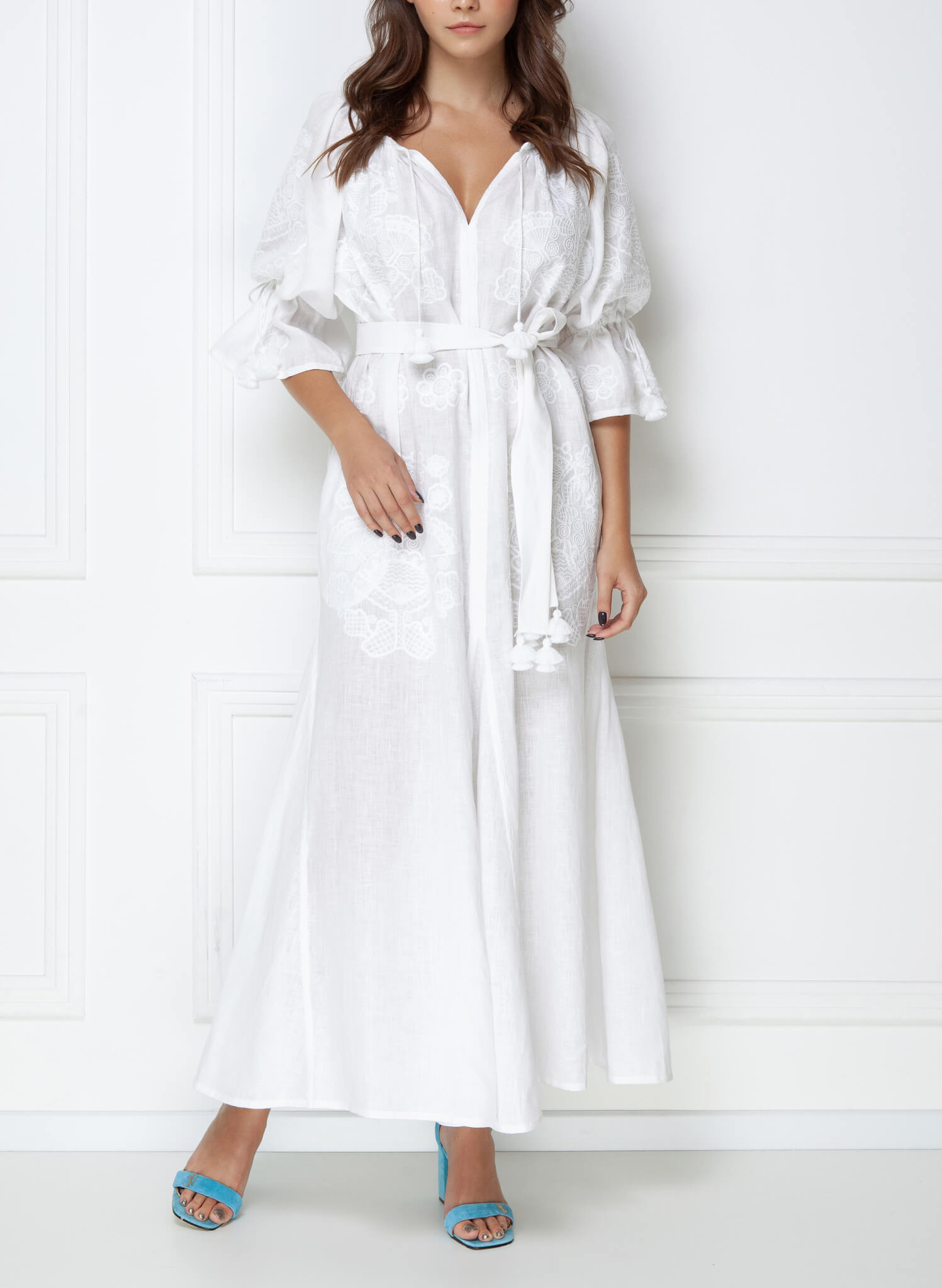 Доставка в течение 3-10 рабочих днейВишито квітковим орнаментом по всій довжині виробу фіалковим та білим кольором. Має вишиті рукави прямого крою із зав’язками, зав’язки з пензликами на горловині. Яскраве поєднання кольорів тканини та вишивки, вільний крій роблять цю богемну сукню вишуканим круїзним вбранням.
