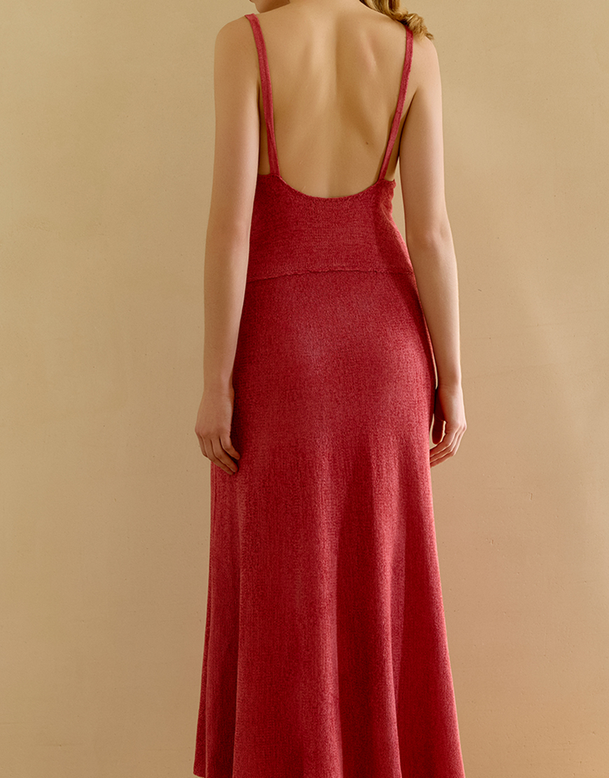 В’язана сукня максі на бретелях, V-подібний виріз, відкрита спина, приталений крій, розкльошена спідниця