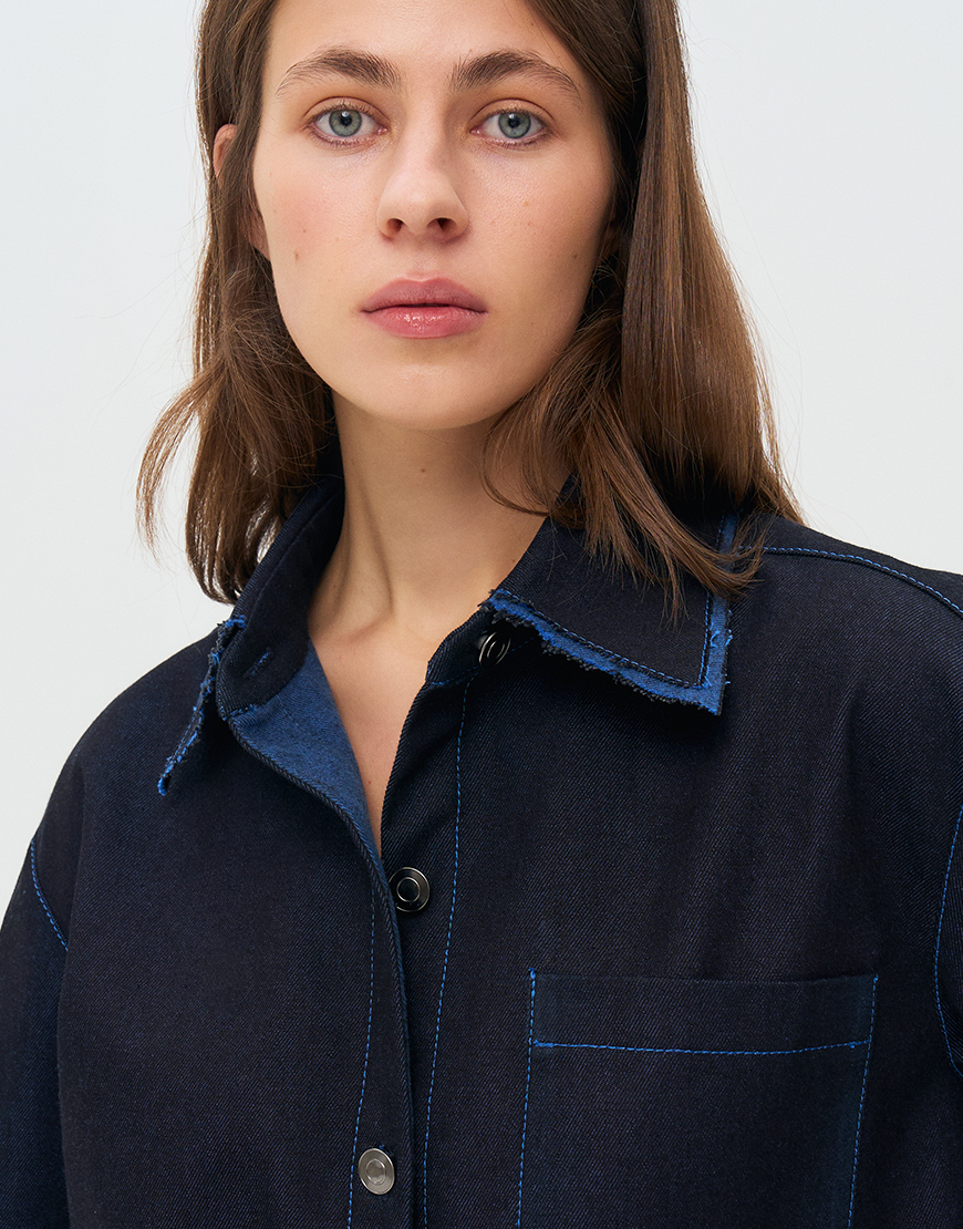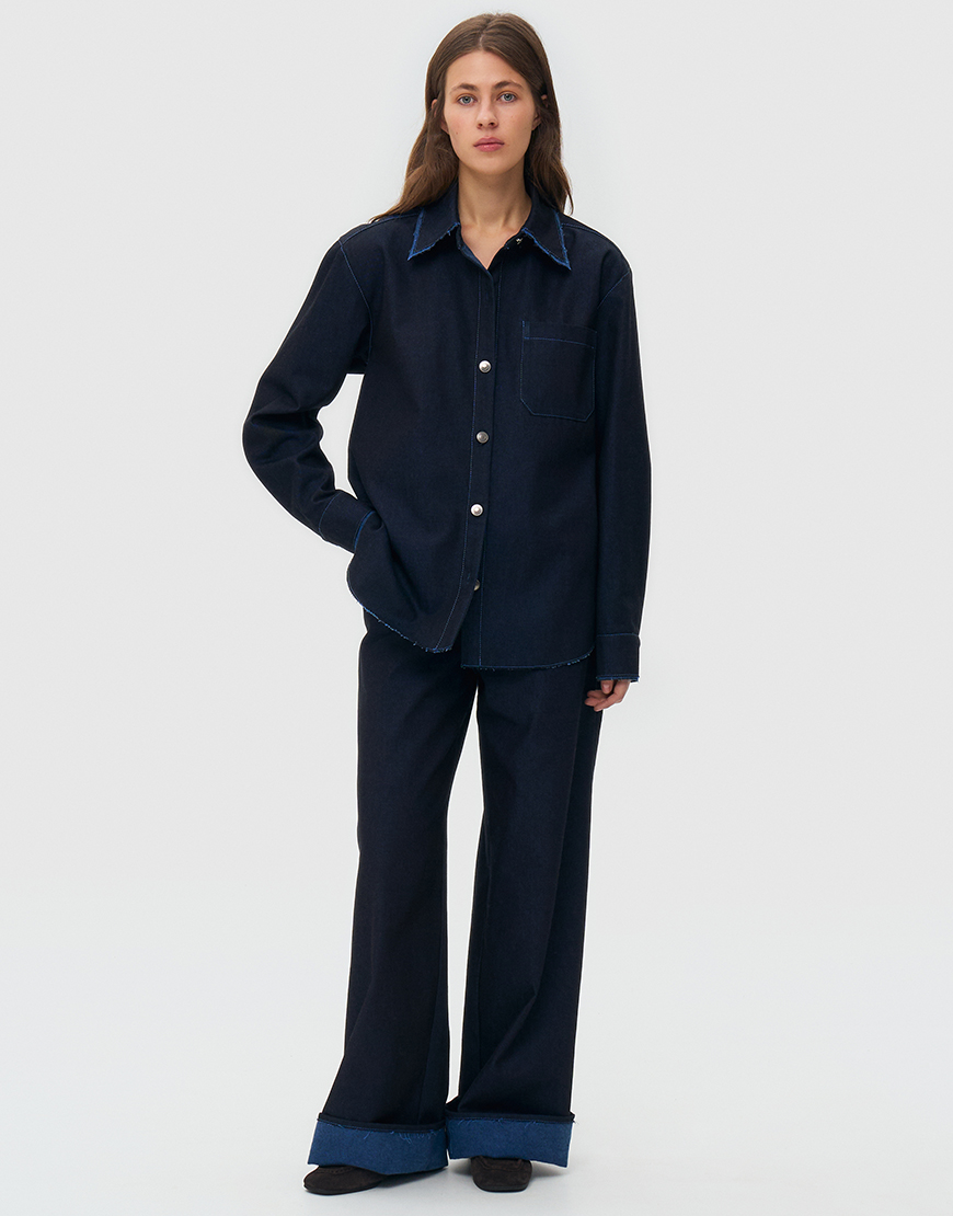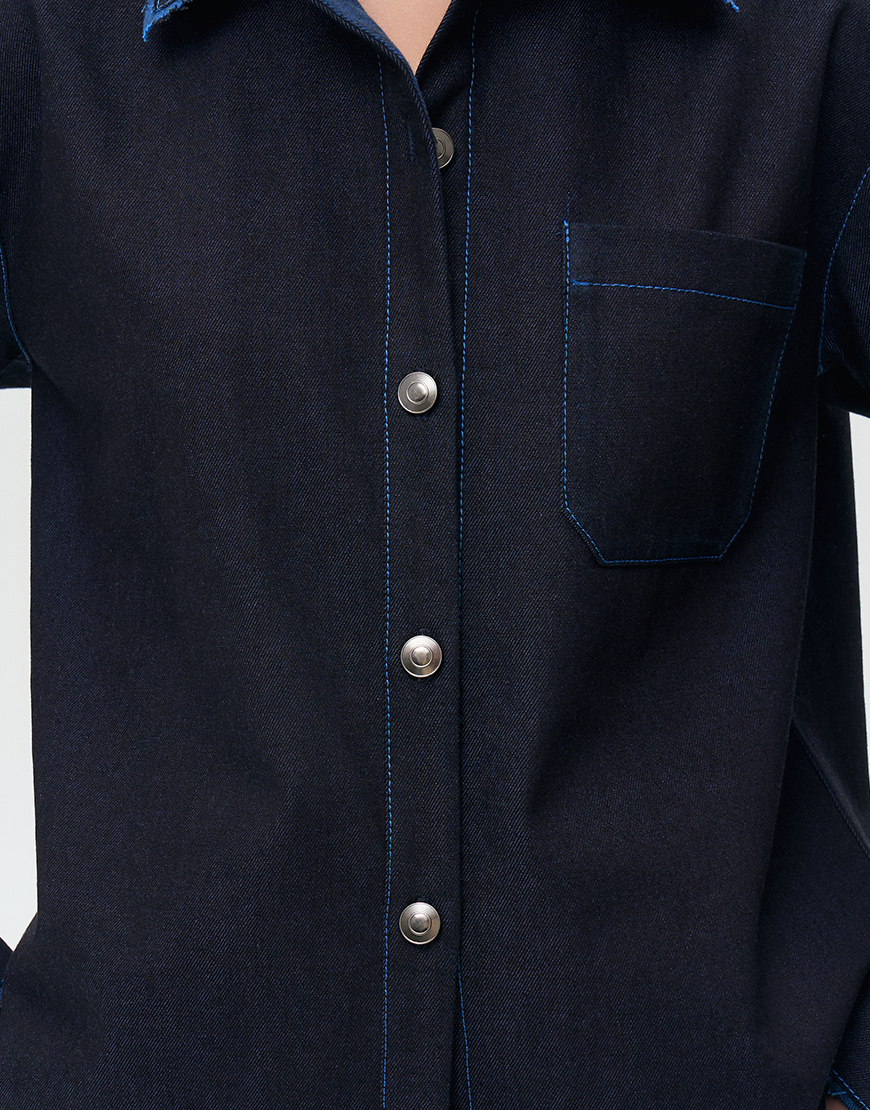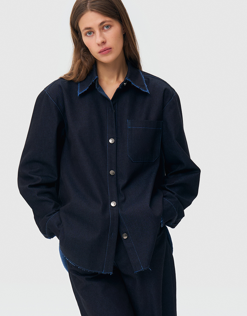 Джинсова сорочка оверсайз, оздоблена металевими ґудзиками на голівці, однією накладною кишенею, довгими рукавами з манжетами на ґудзиках. Джинс не прався та не оброблювався, колір та оздоблення змінюються під час носіння та після прання.