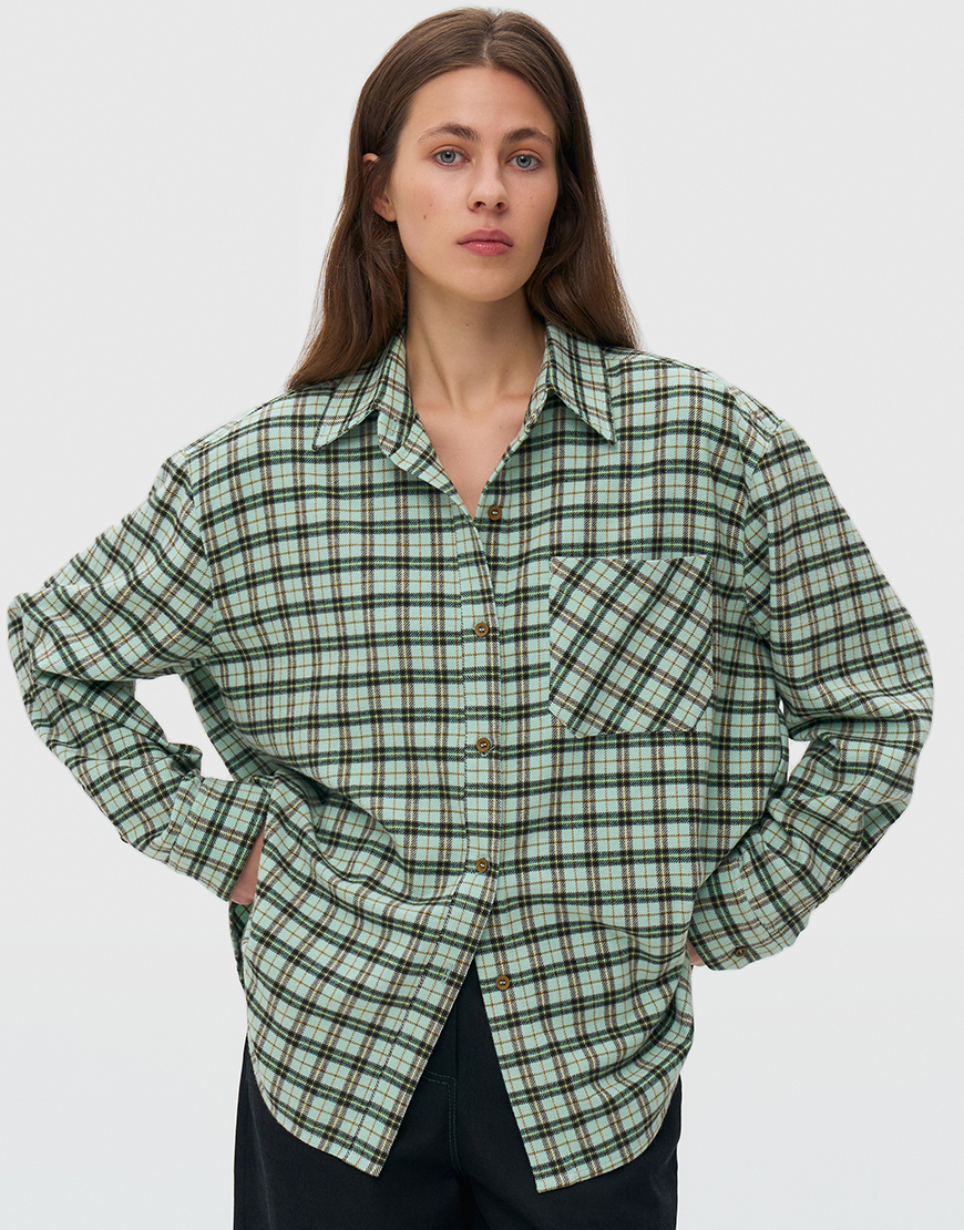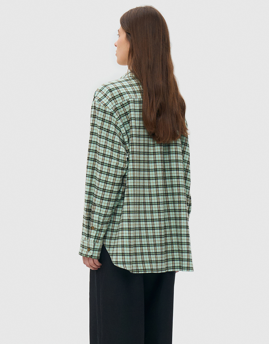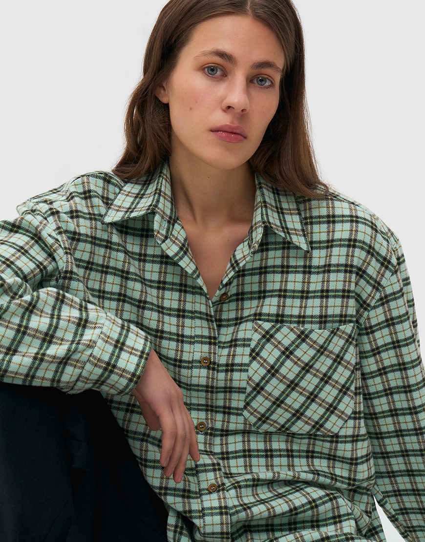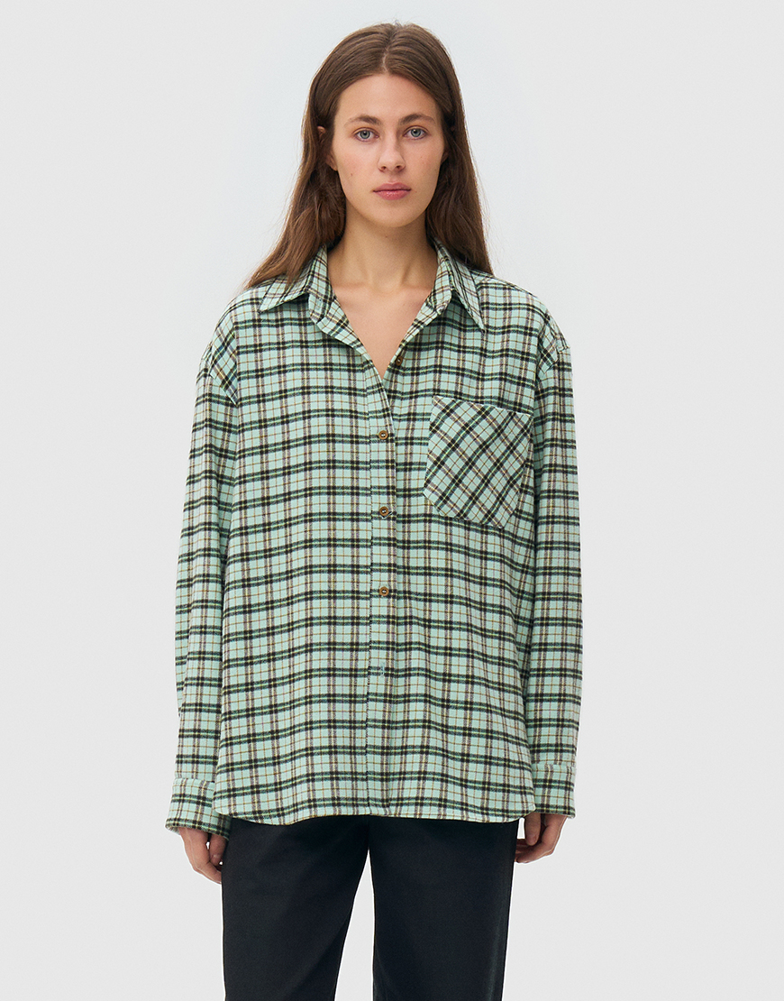 Сорочка оверсайз в клітинку, сорочковий комір, одна накладна кишеня, довгі рукави з манжетами на ґудзиках, застібається на ґудзики спереду