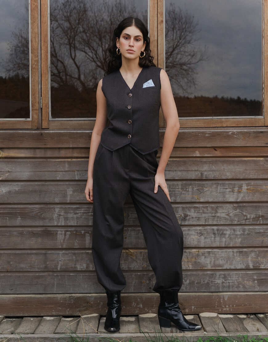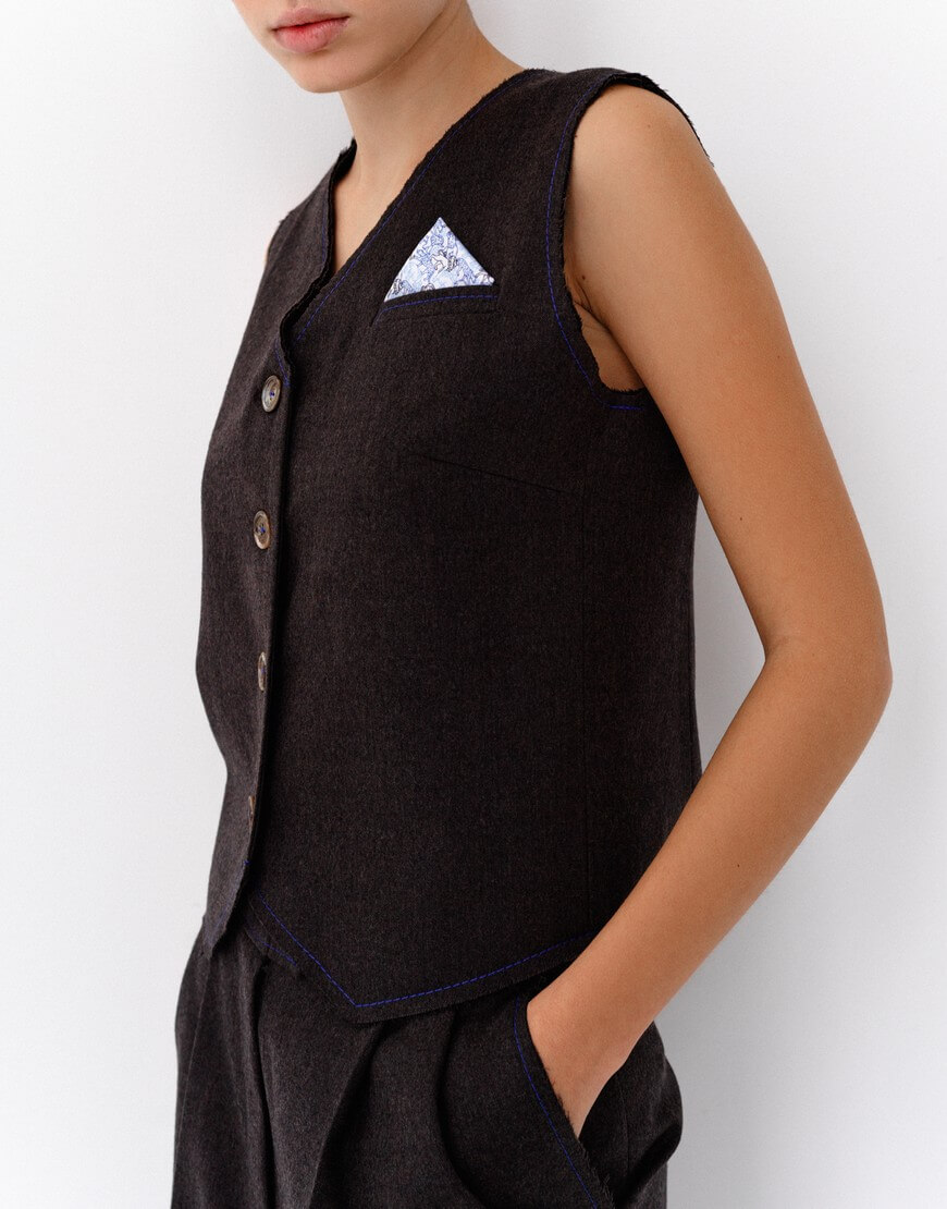 Жилет прямого силуету, застібається на ґудзики, V-подібний виріз, необроблений край, підкладка з віскози