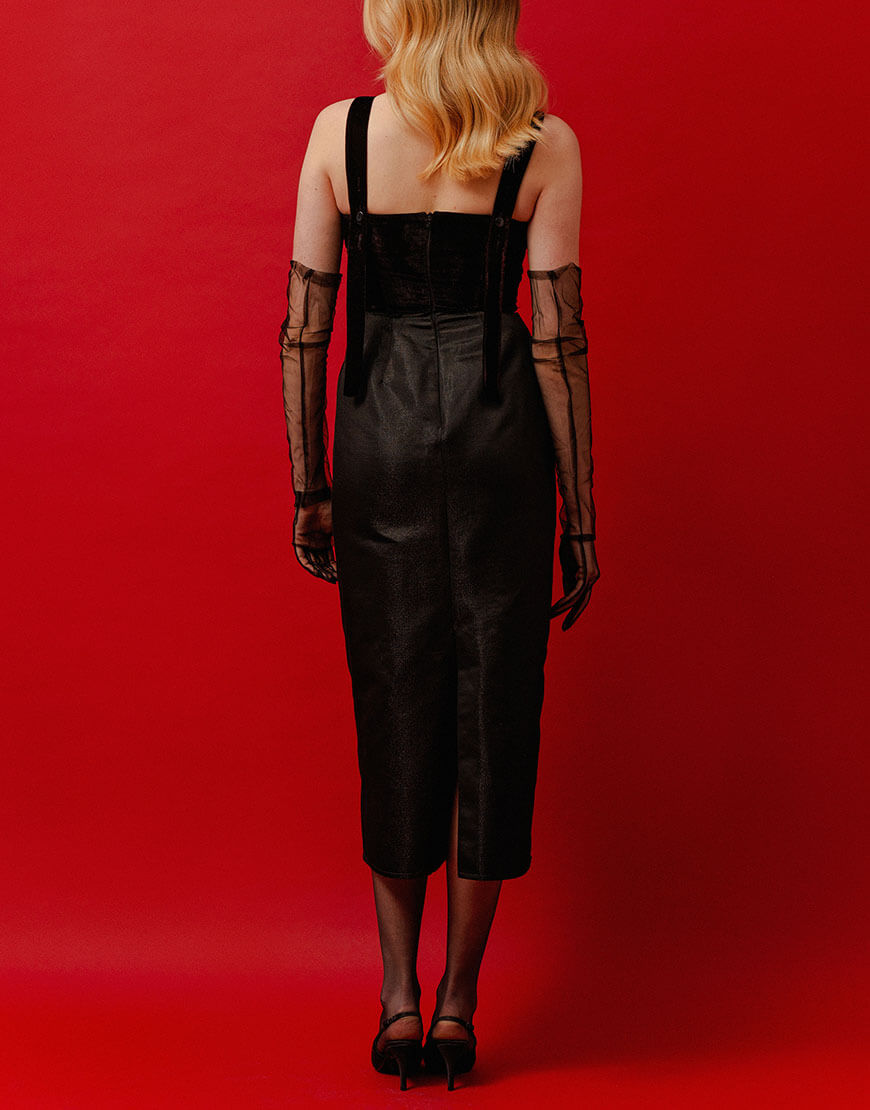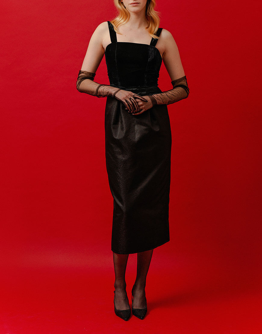 Сукня міді з оксамитовим верхом, приталений силует, застібається на потайну блискавку, регульована довжина бретельок, підкладка з віскози.
