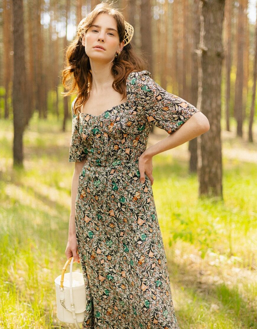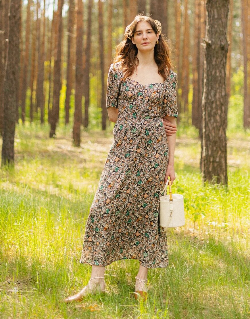 Сукня міді в квітковий принт з ліфом, розкльошений крій, застібається на потаємну блискавку, короткі рукави, підкладка з віскози