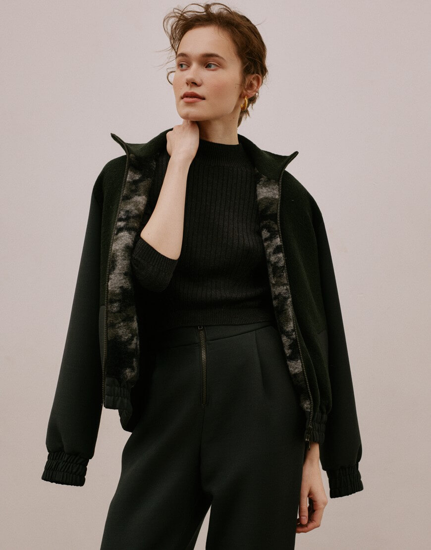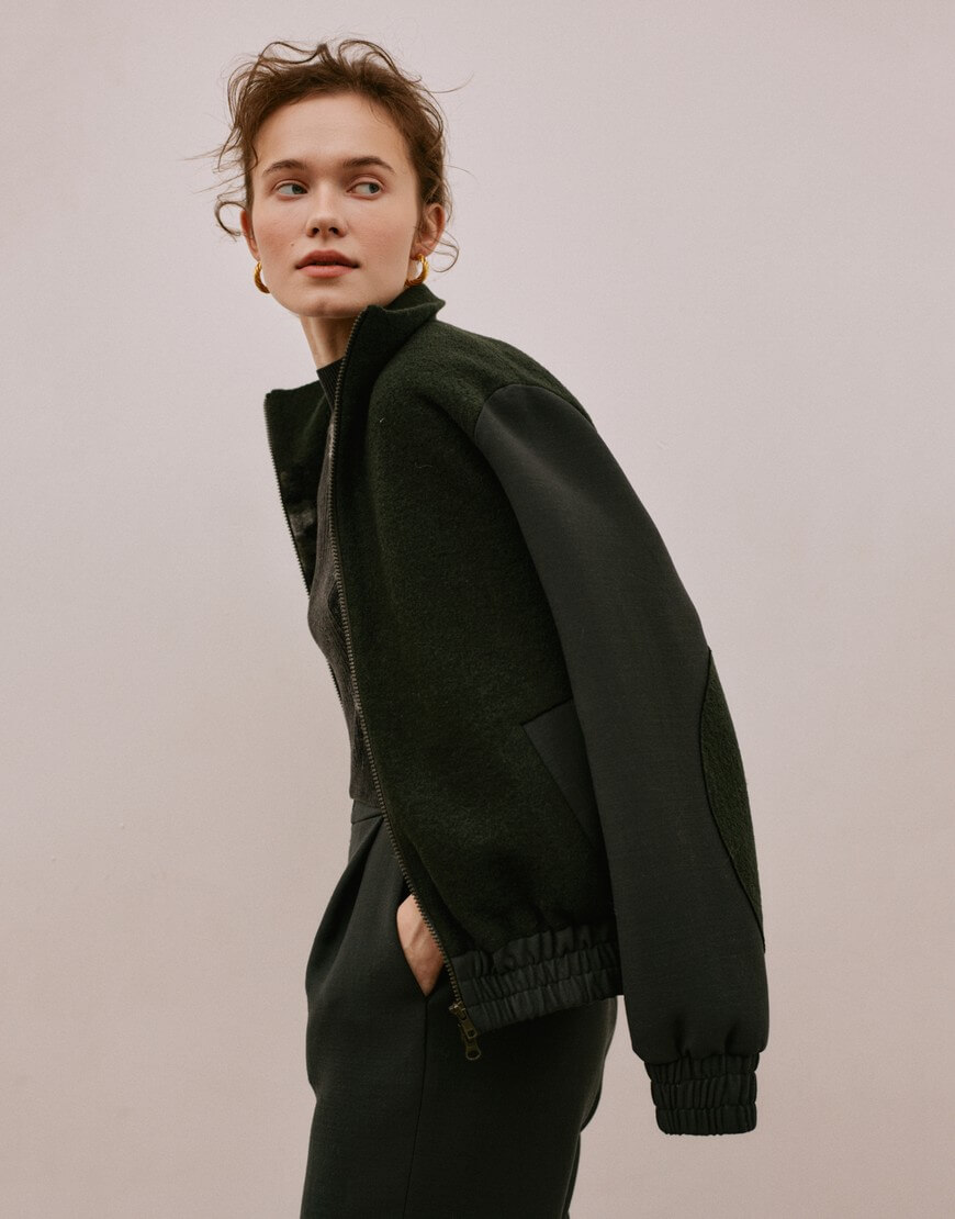Бомбер із вовни, застібається на двонаправлену блискавку, дві бічні кишені, низ та манжети оздоблені гумкою, підкладка з вовни та віскози