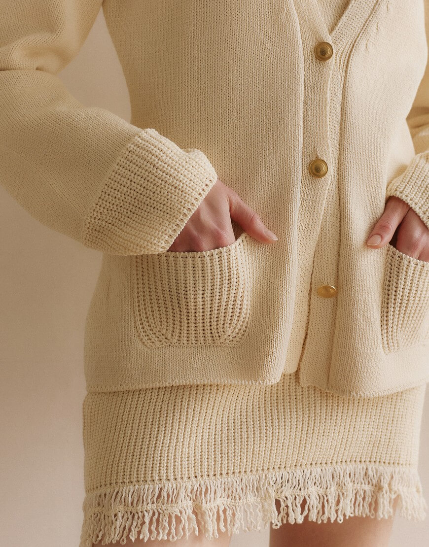 В’язаний кардиган з декоративними ґудзиками, приталений крій, застібається на ґудзики, V-подібний виріз, дві накладні кишені
