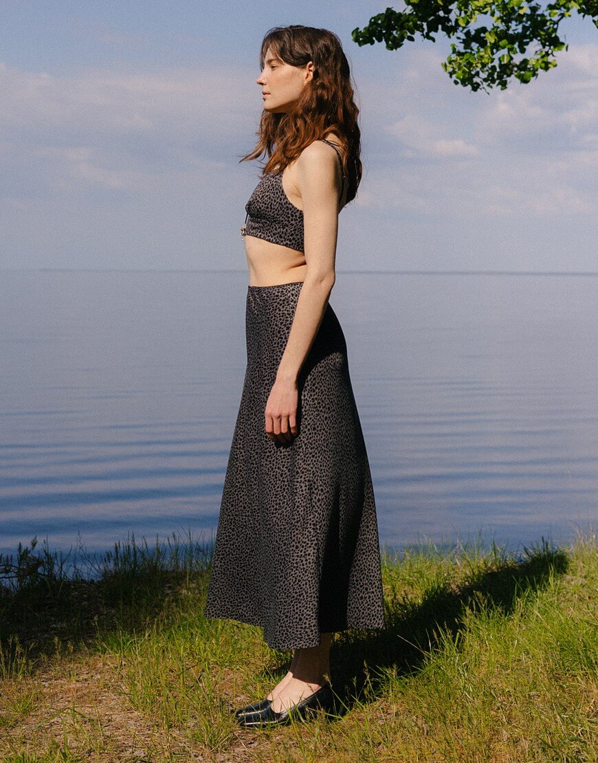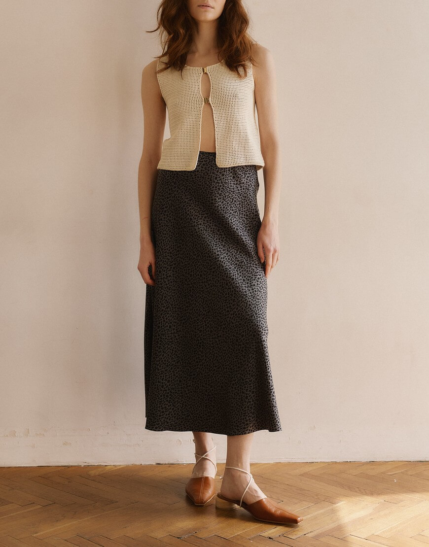 Спідниця міді, приталений крій, дві бічні кишені, застібається на потаємну блискавку, розріз ззаду