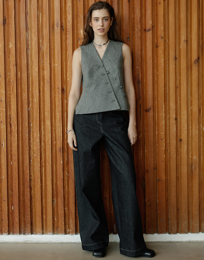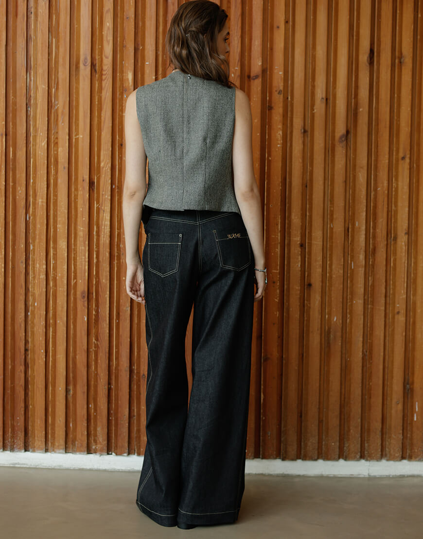 Джинси з середньою висотою посадки, вільний крій, широкі штанини, ззастібаються на блискавку і ґудзик, дві бічні кишені, дві накладні кишені ззаду