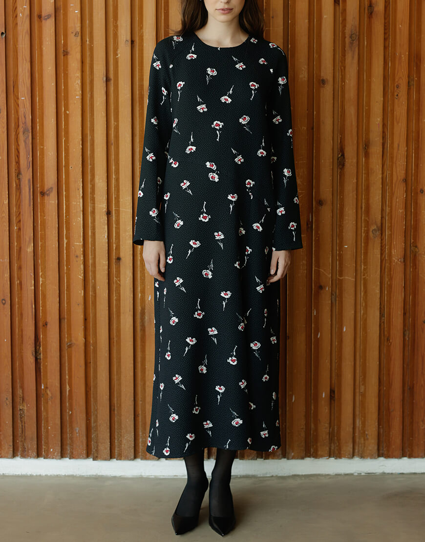 Сукня міді в квітковий принт, вільний крій, круглий комір, застібається на потаємну блискавку ззаду, розріз спереду, довгі рукави.