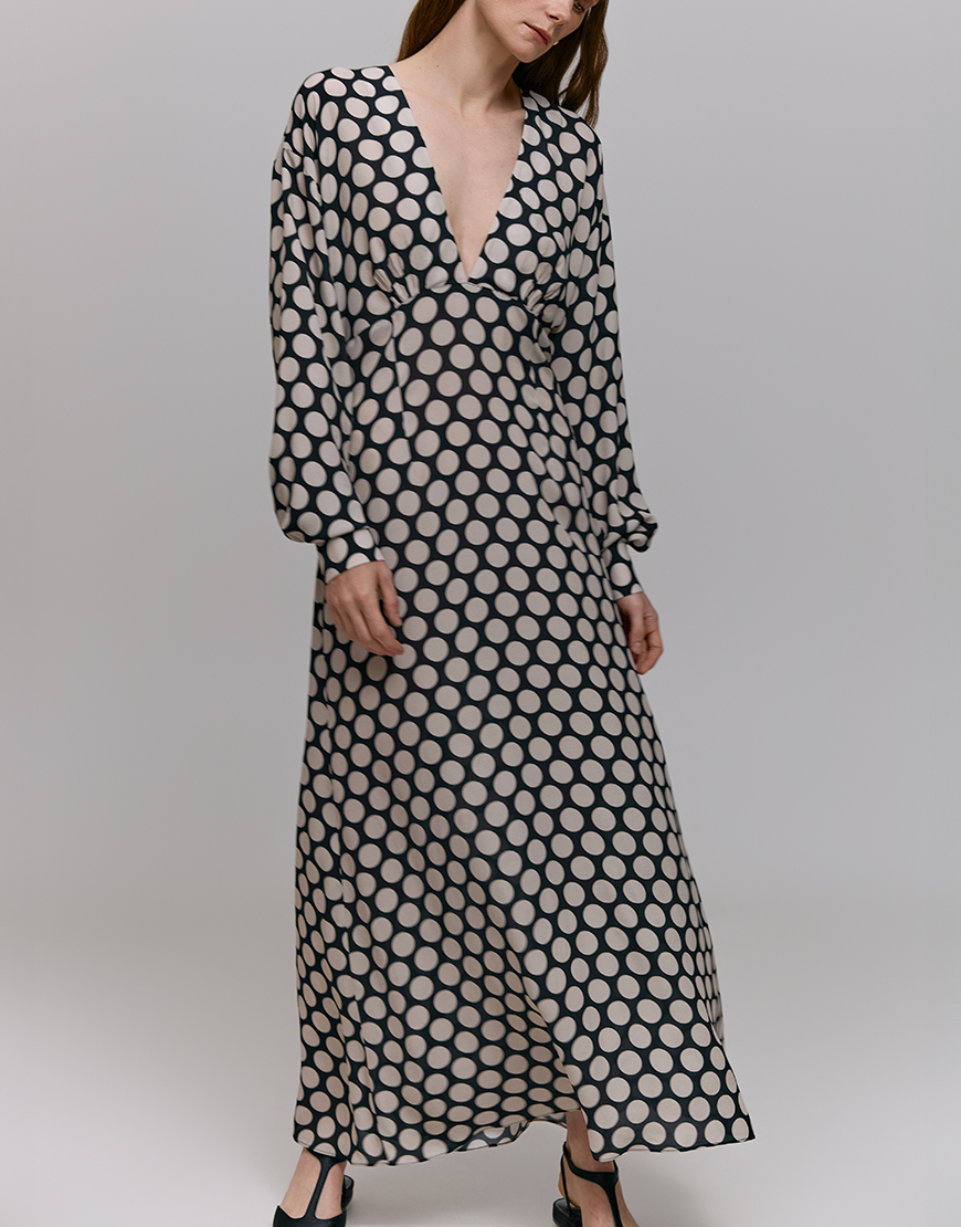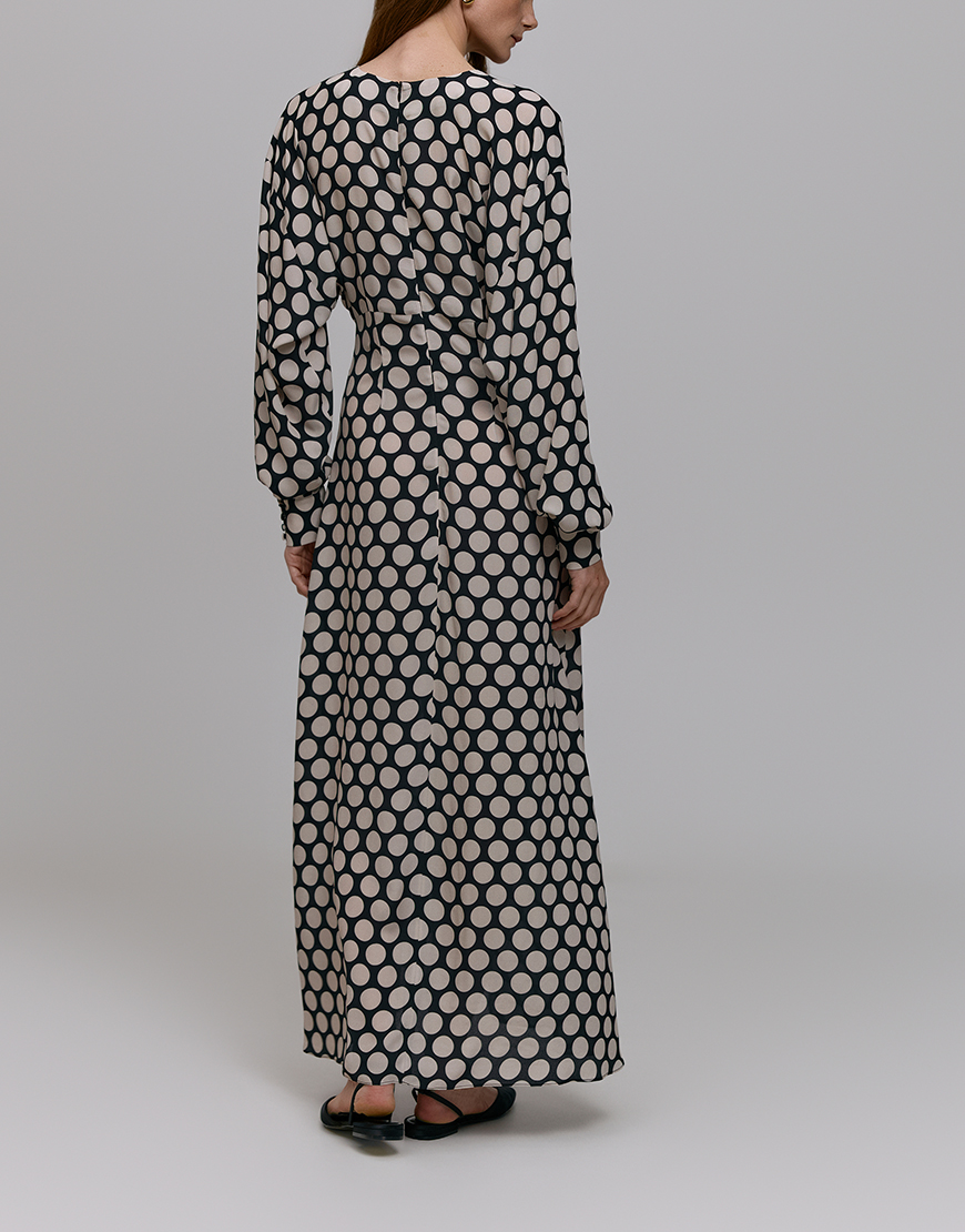 Сукня максі в горошок з відрізним ліфом, приталений крій, розкльошена спідниця-трапеція, застібається на потаємну блискавку ззаду, довгі рукави