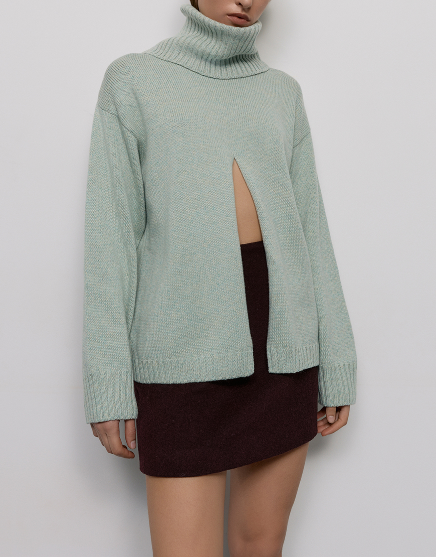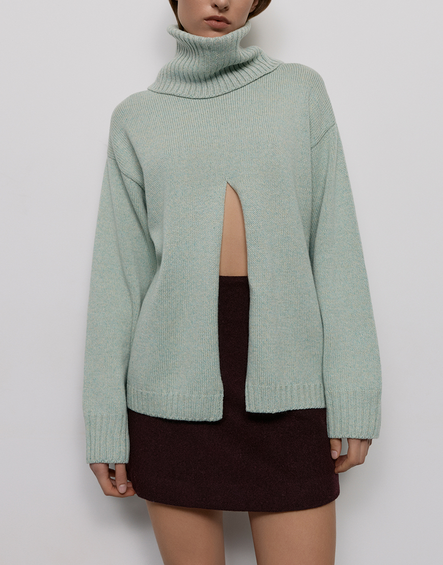 В’язаний светр вільного силуету з високою горловиною, розріз спереду, довгі рукави