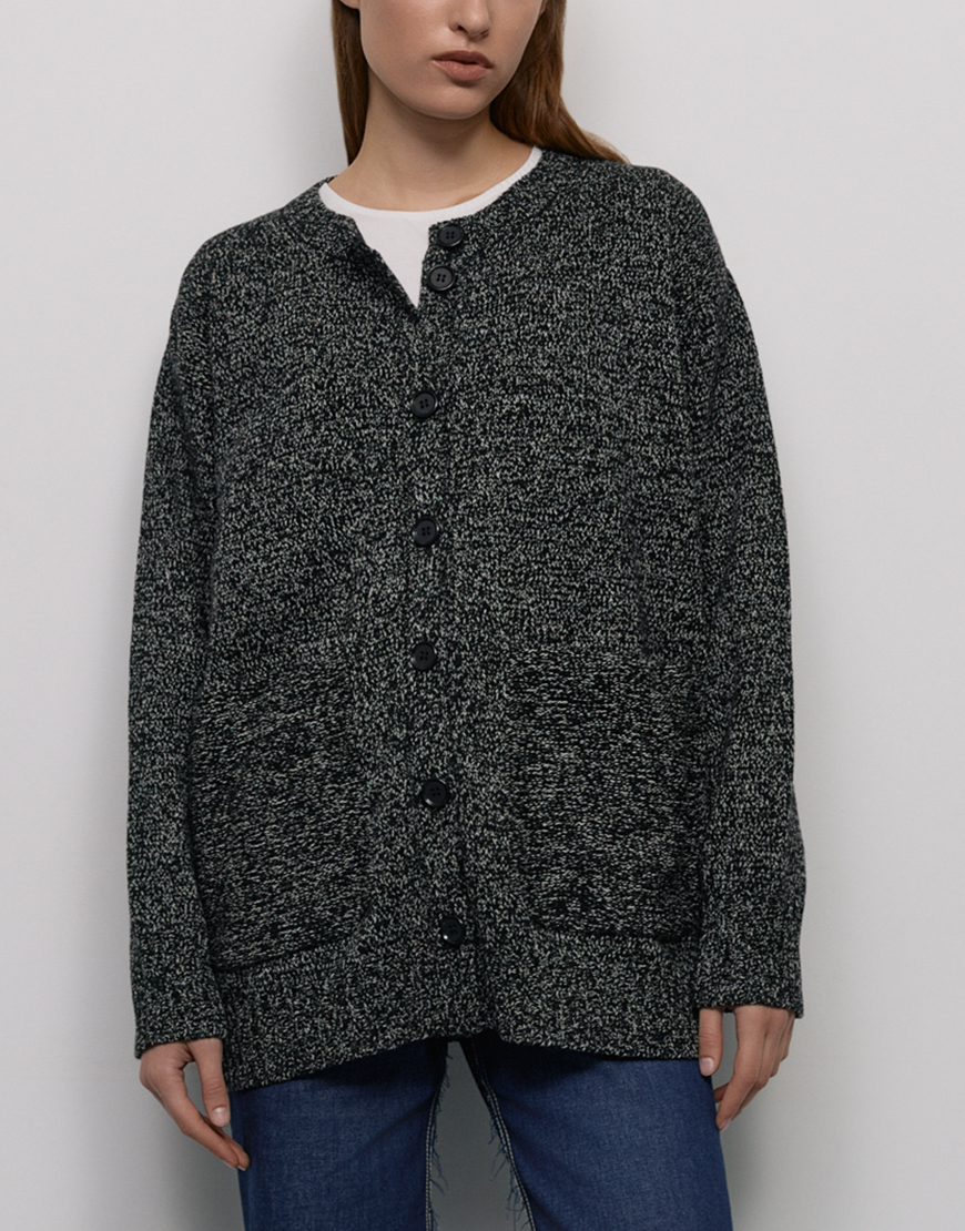 В’язаний кардиган вільного силуету з круглим вирізом, застібається на ґудзики спереду, дві накладні кишені, окантовка в рубчик