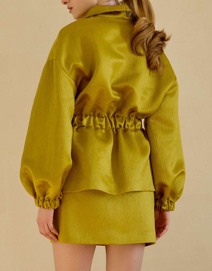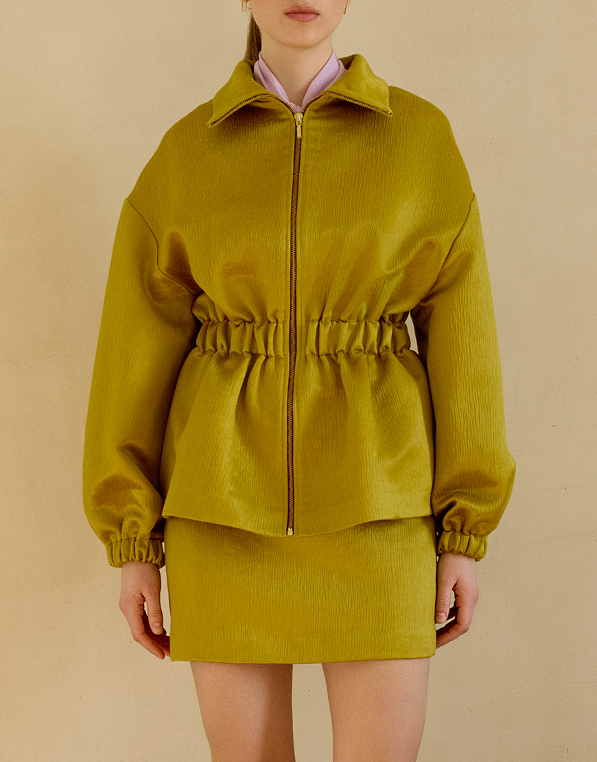 Куртка-бомбер оверсайз-силуету з високим коміром та резинкою на талії, застібається на блискавку спереду, дві бічні кишені, манжети оздоблені резинкою