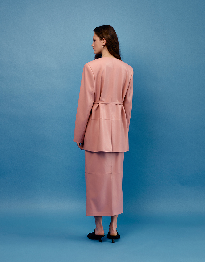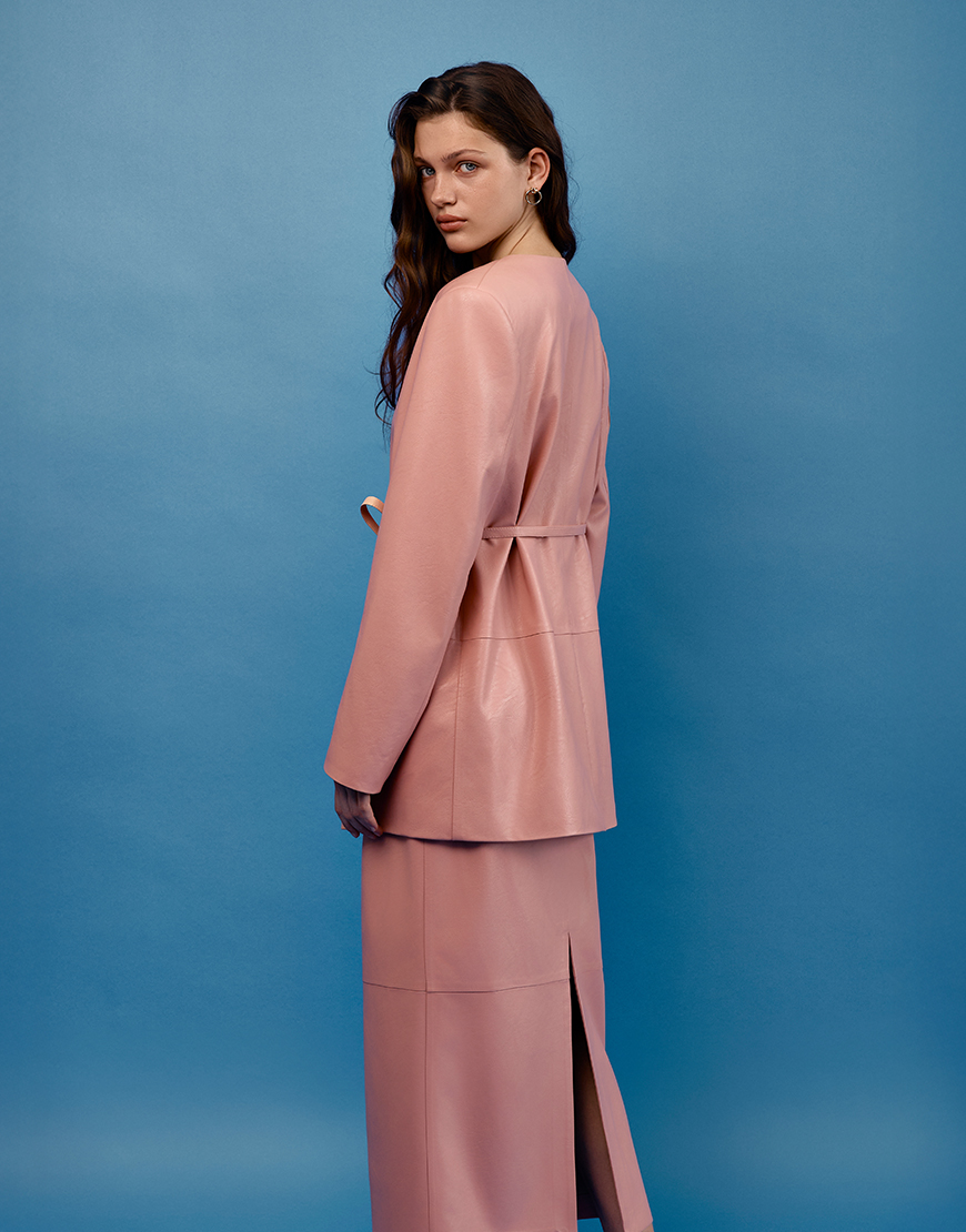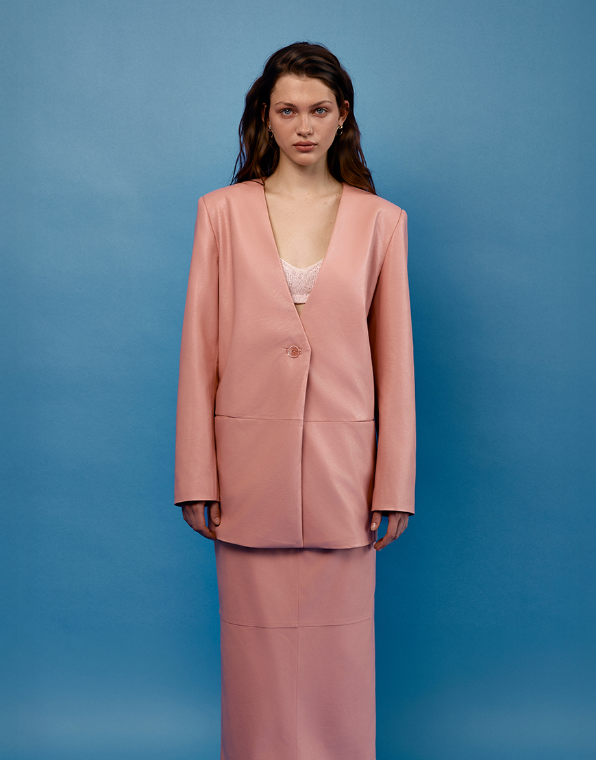 Піджак прямого силуету з екошкіри, підкладені плечі, застібається на один ґудзик спереду, дві бічні кишені, шліца ззаду, підкладка з віскози