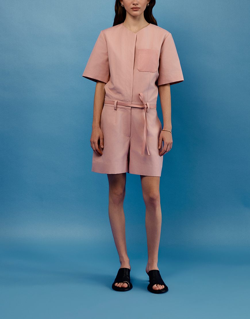 Комбінезон з короткими рукавами, шлевки для пояса, одна накладна кишеня з еко-шкіри, дві бічні кишені, застібається на гудзики спереду та блискавку, оздоблений поясом з еко-шкіри