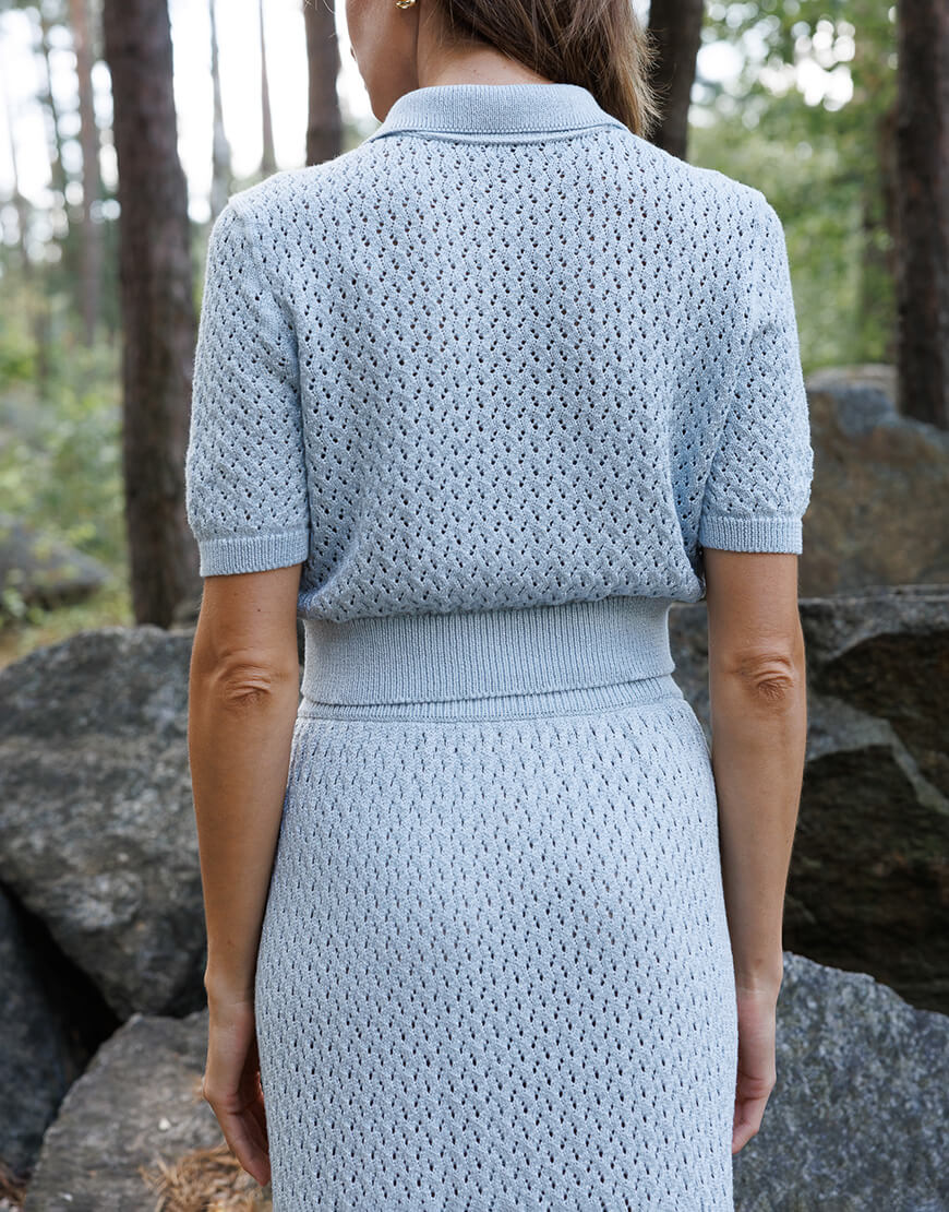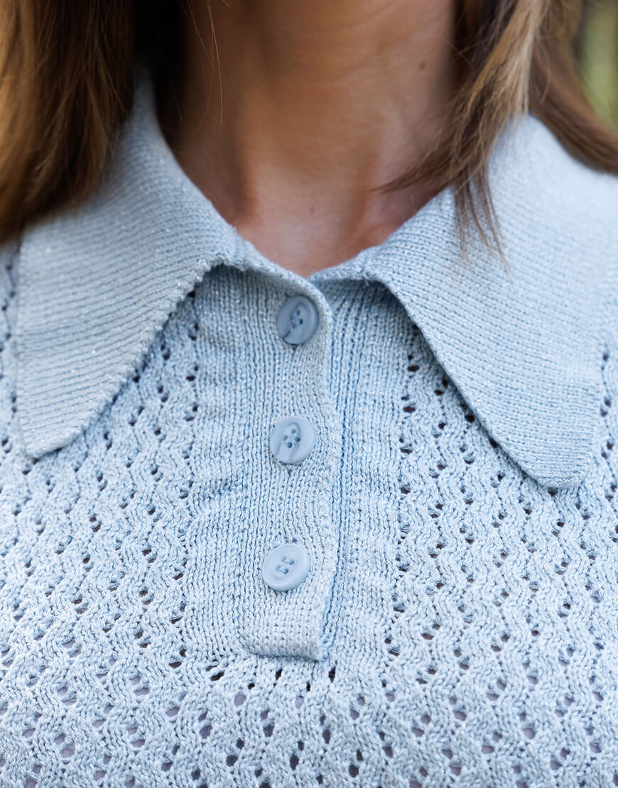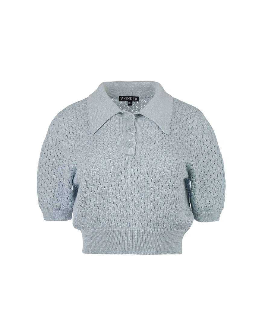 Ажурне кроп-поло з італійської пряжі з люрексом. Поло має 3 ґудзики, пофарбовані у тон пряжі.