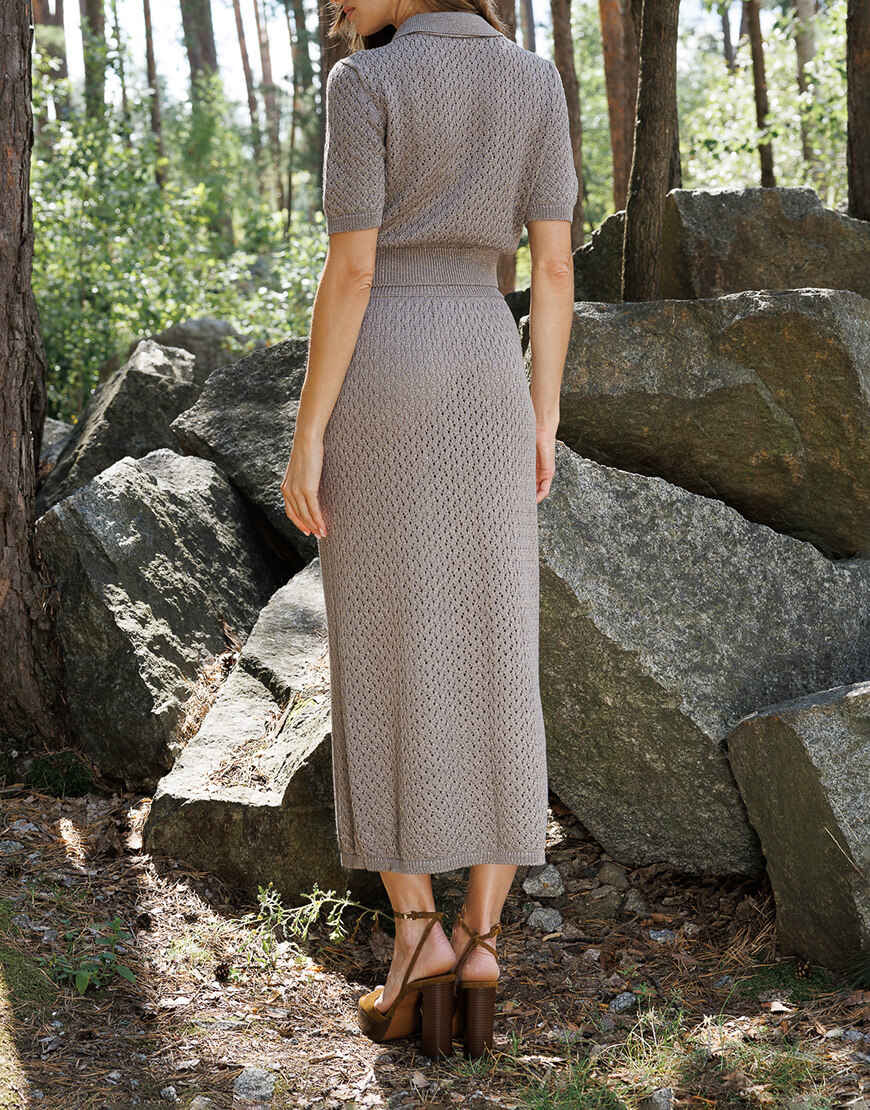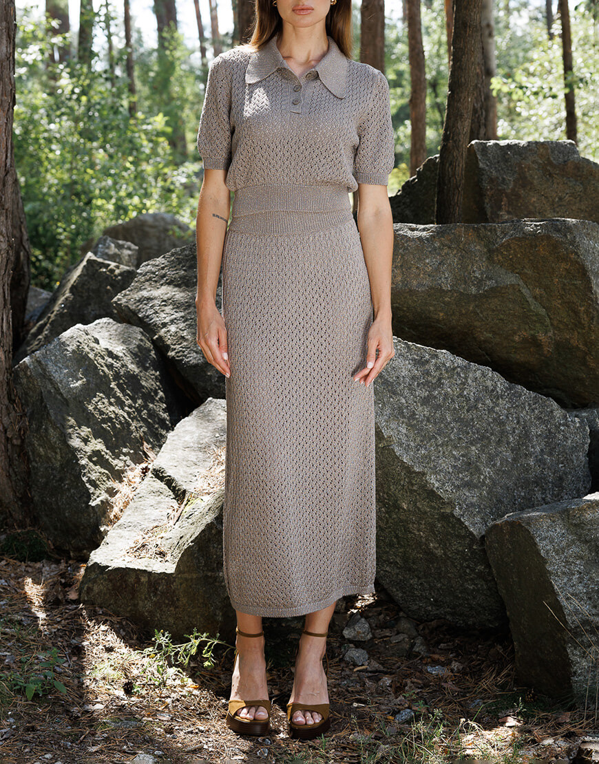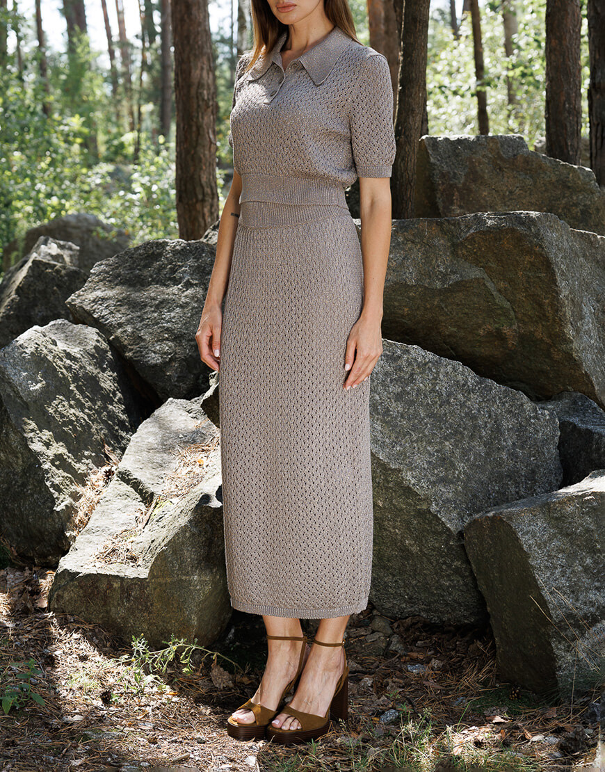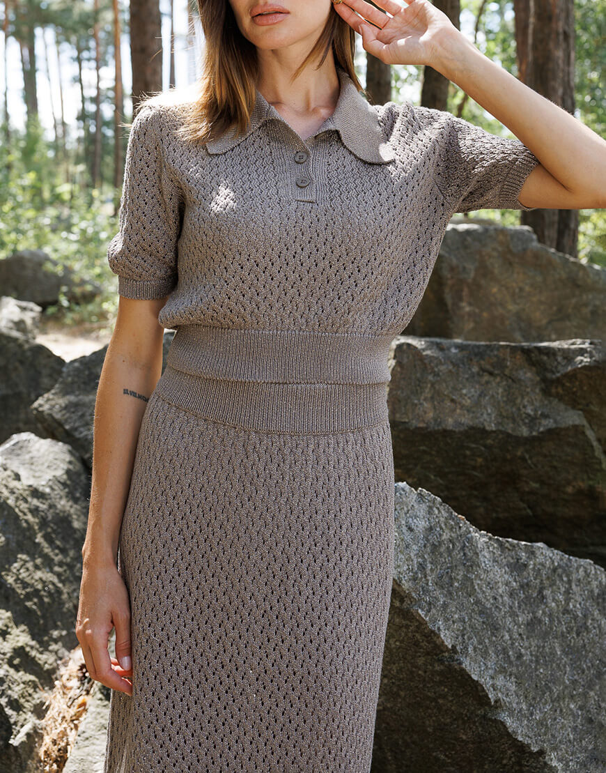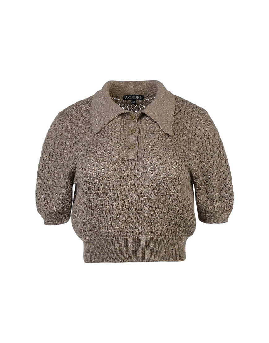 Ажурне кроп-поло з італійської пряжі з люрексом. Поло має 3 ґудзики, пофарбовані у тон пряжі.