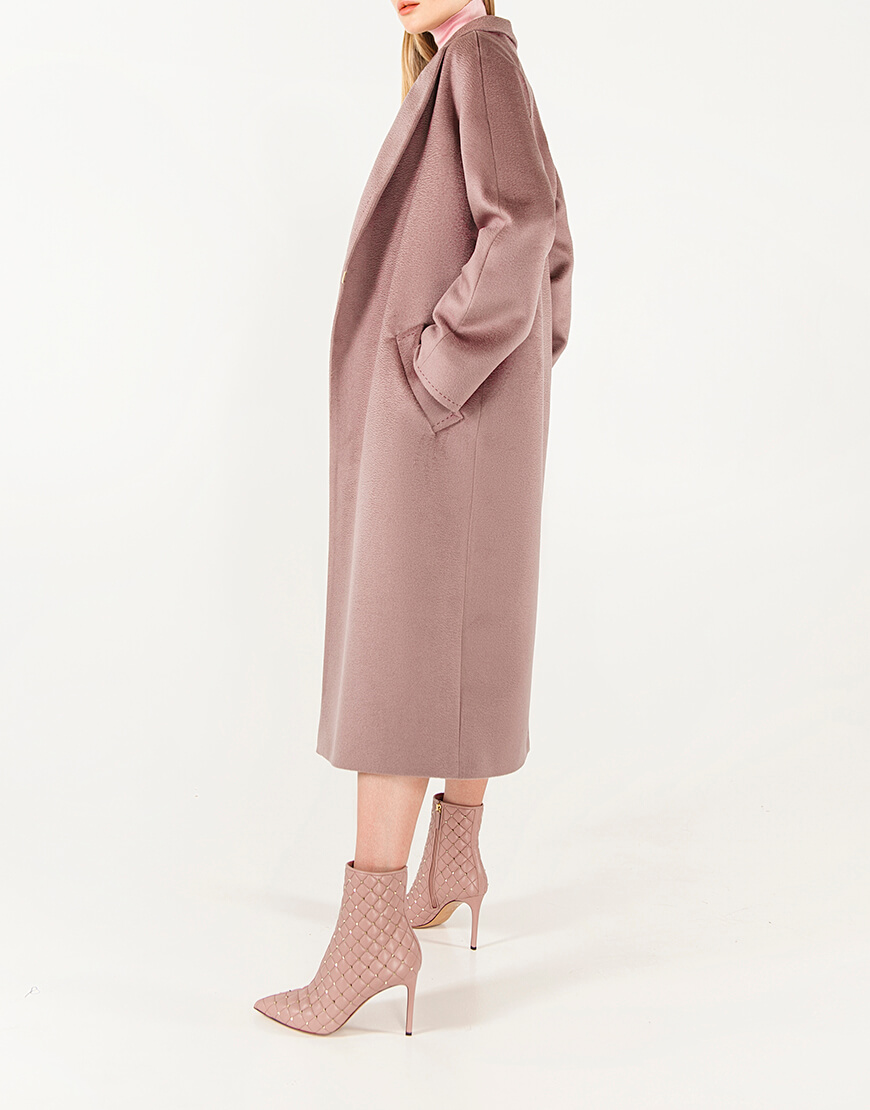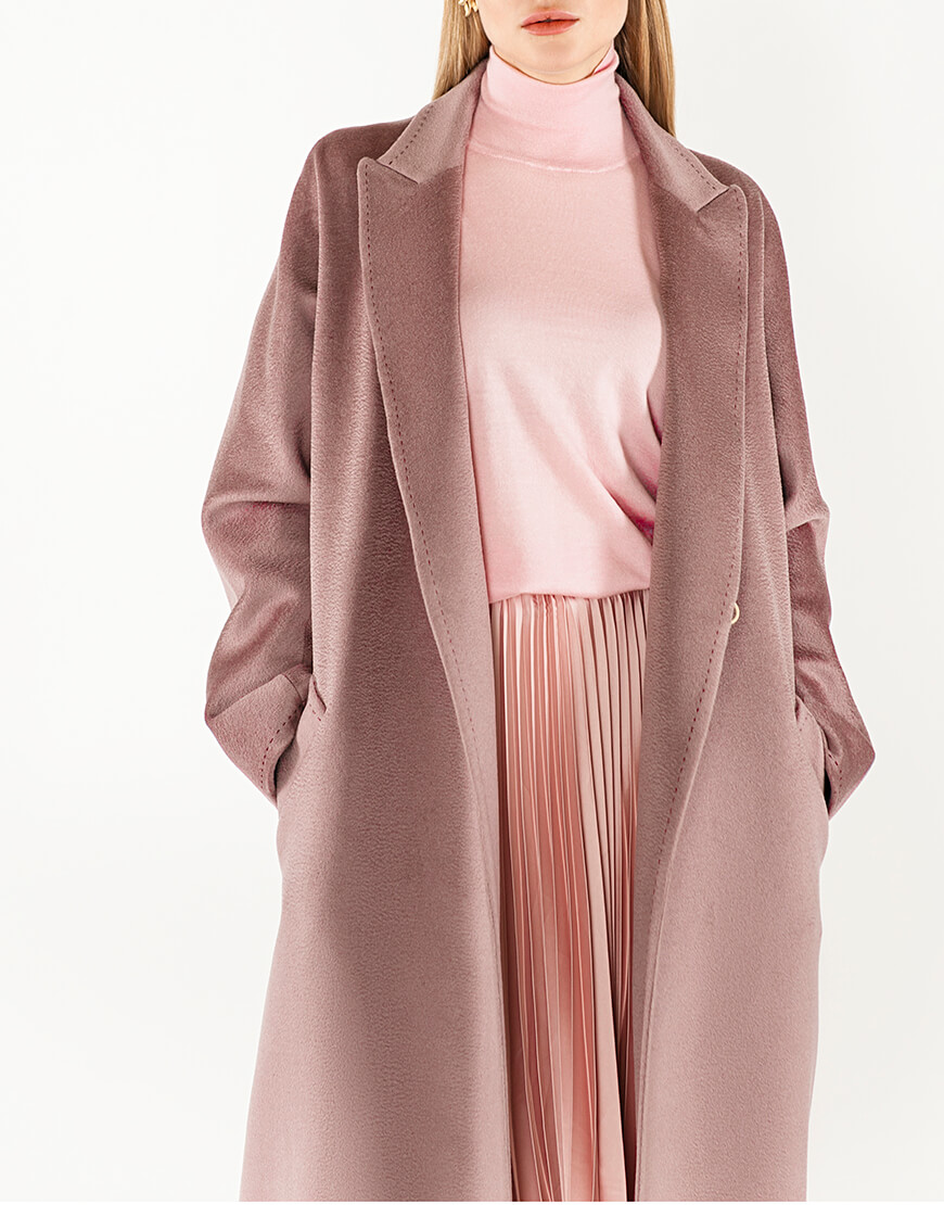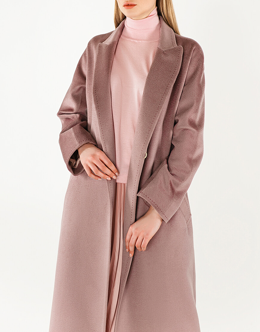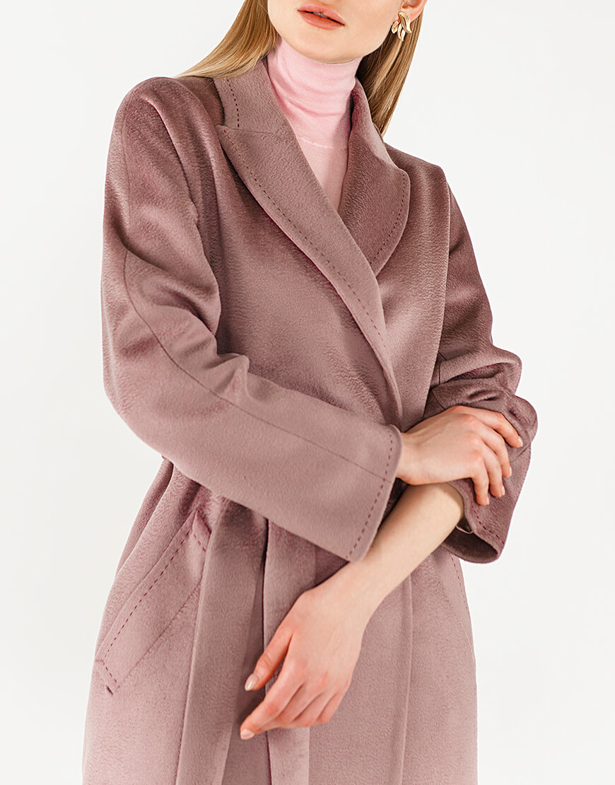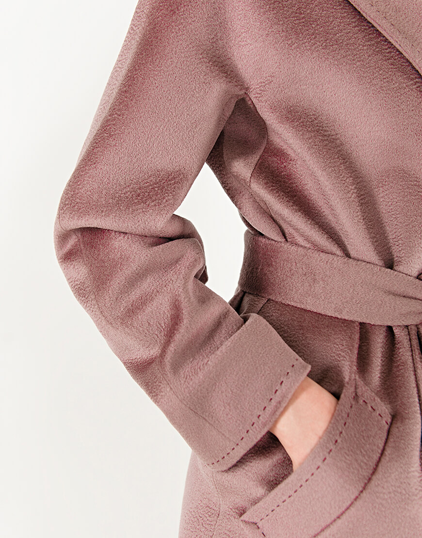 Пальто з кашеміру на запах з поясом. Тканина з характерною хвилею zibellino, яка притаманна кашемірам найвищої якості. Лацкан пальто і рукава прошиті дукоративним рядком “ручний стібок”. Сезон: весна. Довжина пальта 118 см.