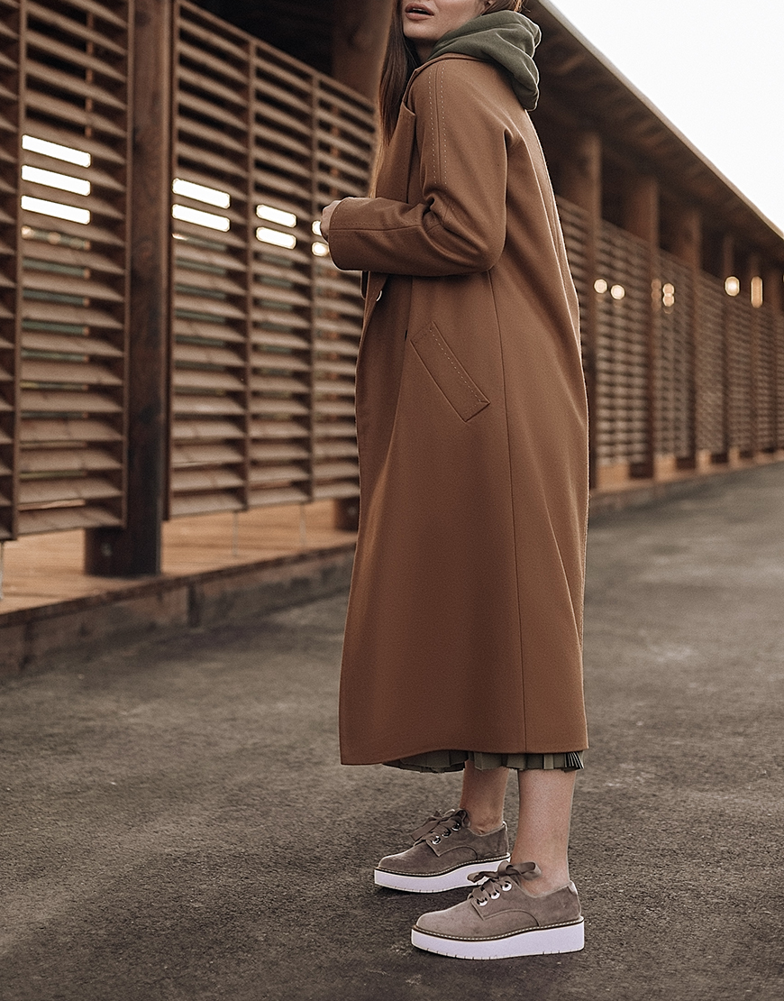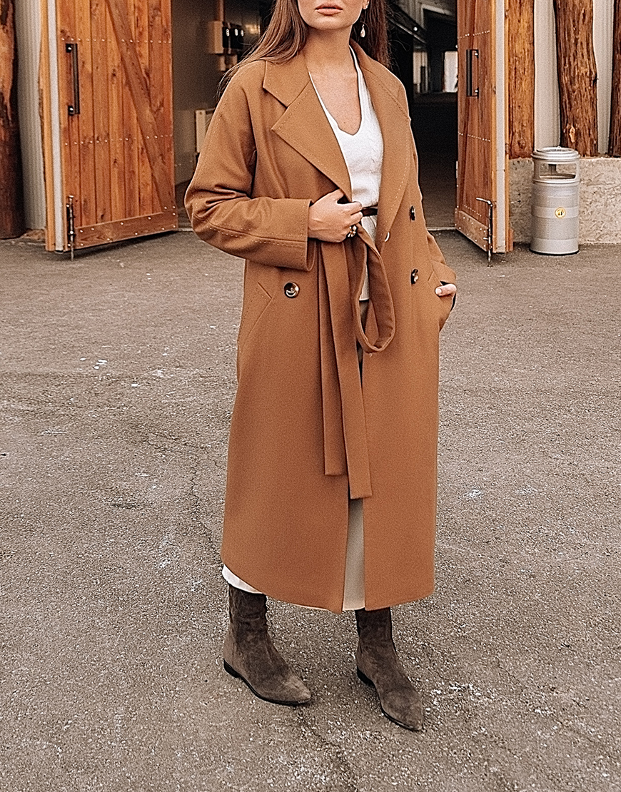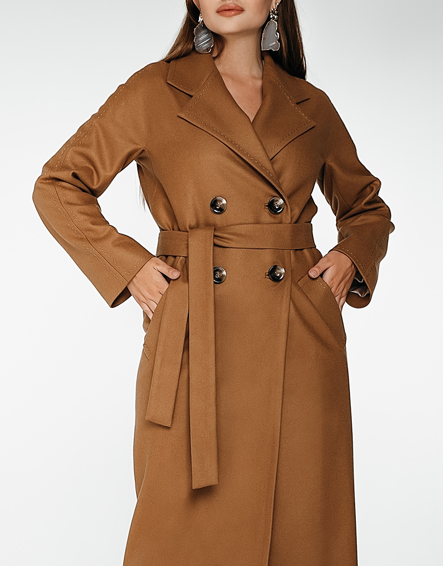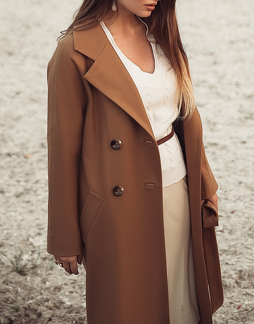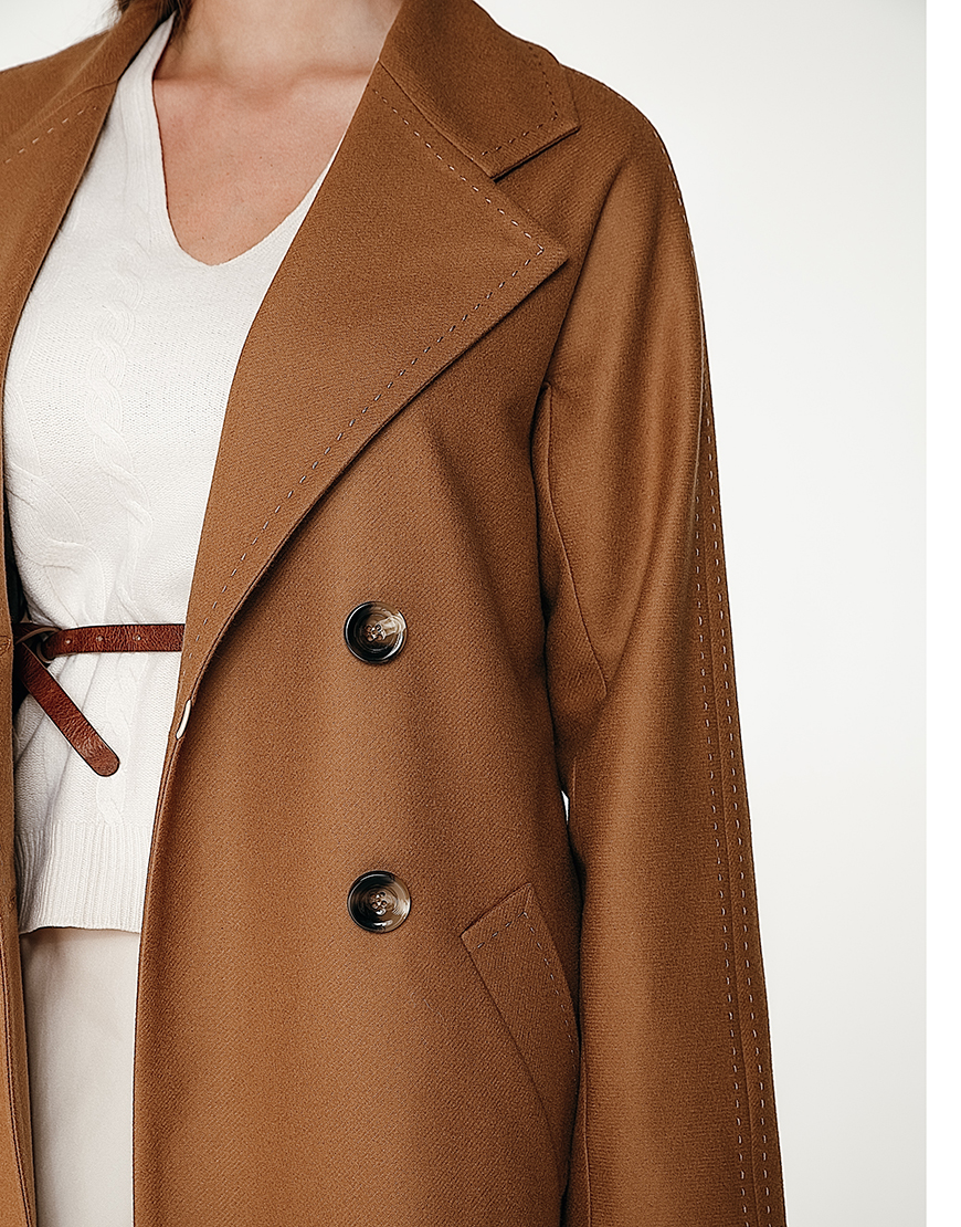 Класичне двобортне пальто з рукавом реглан і відстрочкою “ручний стібок”.